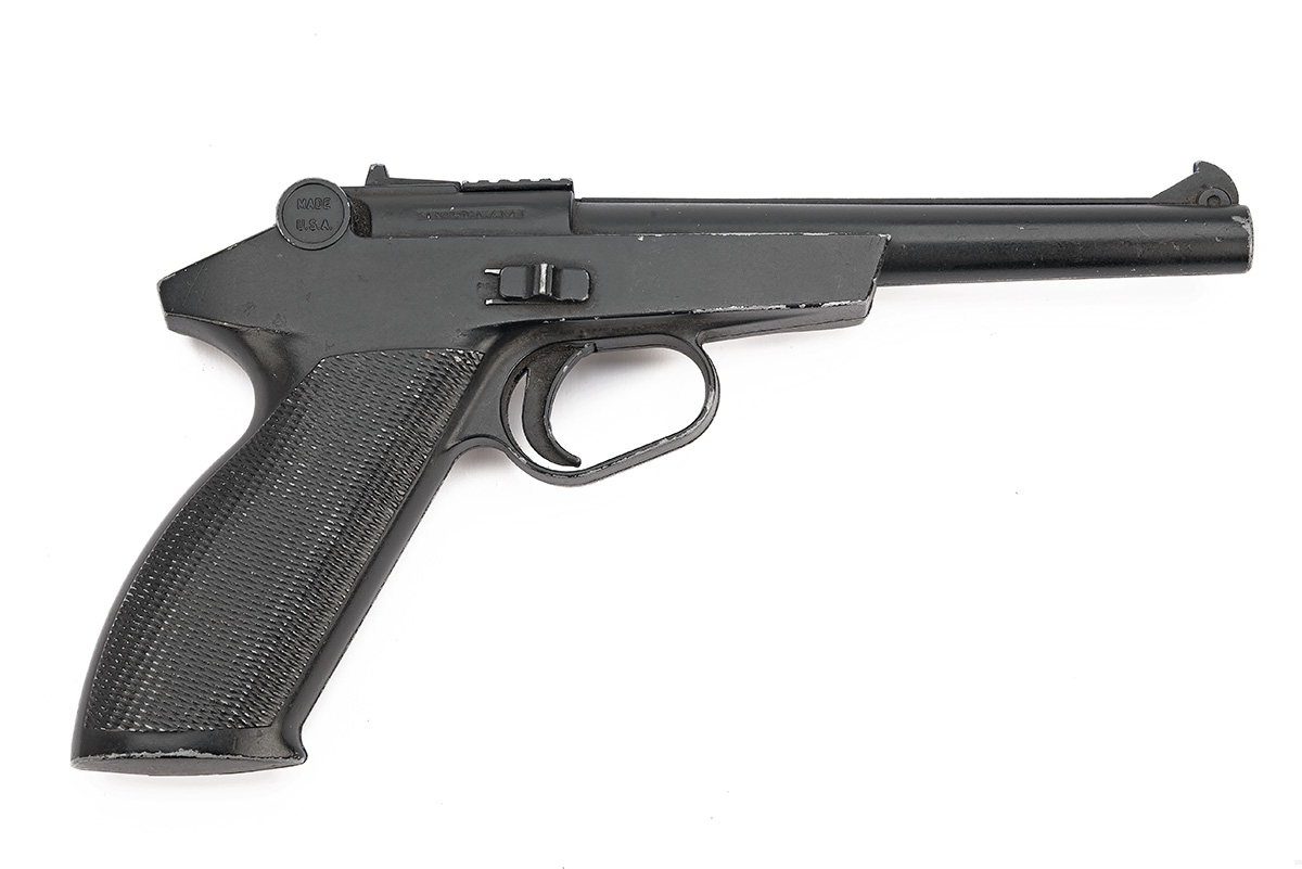 A .177 (BB) HEALTHWAYS MODEL TOP-SCORE 175 REPEATING AIR-PISTOL, serial no. 0442613, circa 1976, with tapering black painted 6in. barrel, black painted alloy receiver with integral chequered grip, much original finish remaining