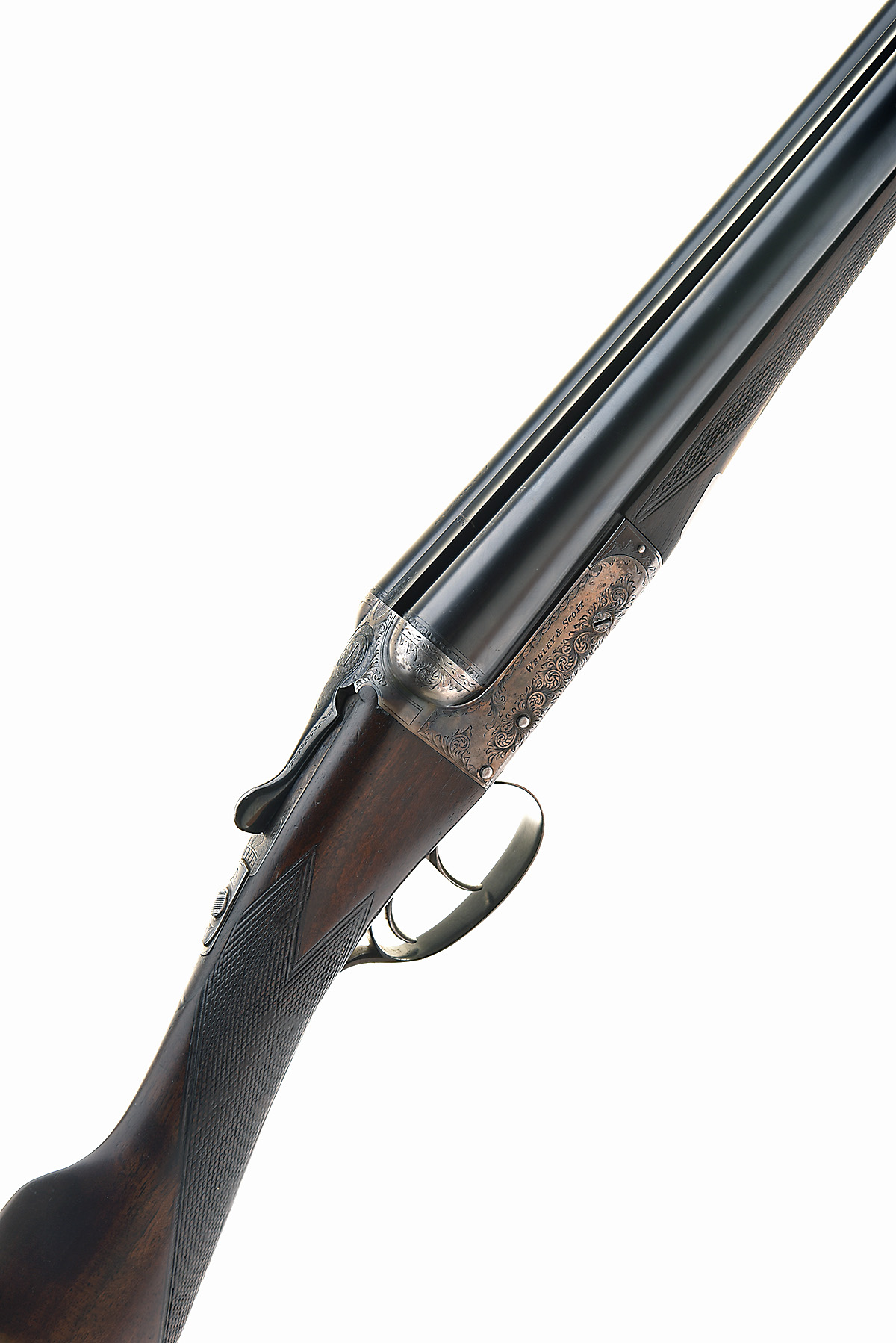 WEBLEY & SCOTT 12-BORE 'MODEL 700' BOXLOCK EJECTOR, serial no. 133553, dated 1953, 28in. nitro barrels, 2 3/4in. chambers, bored approx. 1/4 and full choke, automatic safety, border and partial scroll engraving, retaining traces of original colour-hardening and finish, 15 1/2in. stock including 1in. wooden extension, weight 6lb. 9oz.