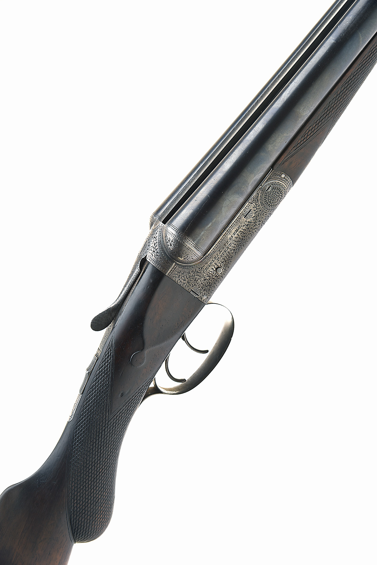 CHARLES LANCASTER 12-BORE ASSISTED-OPENING BOXLOCK EJECTOR, serial no. 08176, circa 1900, 30in. nitro blacked damascus barrels (some pits and dents), rib engraved 'CHARLES LANCASTER. 151. NEW BOND ST. LONDON. PATENT EJECTOR.', 2 1/2in. chambers, bored approx. imp. cyl. and 1/2 choke, automatic safety, beaded border and acanthus scroll engraving, 14 1/4in. semi-pistolgrip stock, weight 6lb. 11oz.