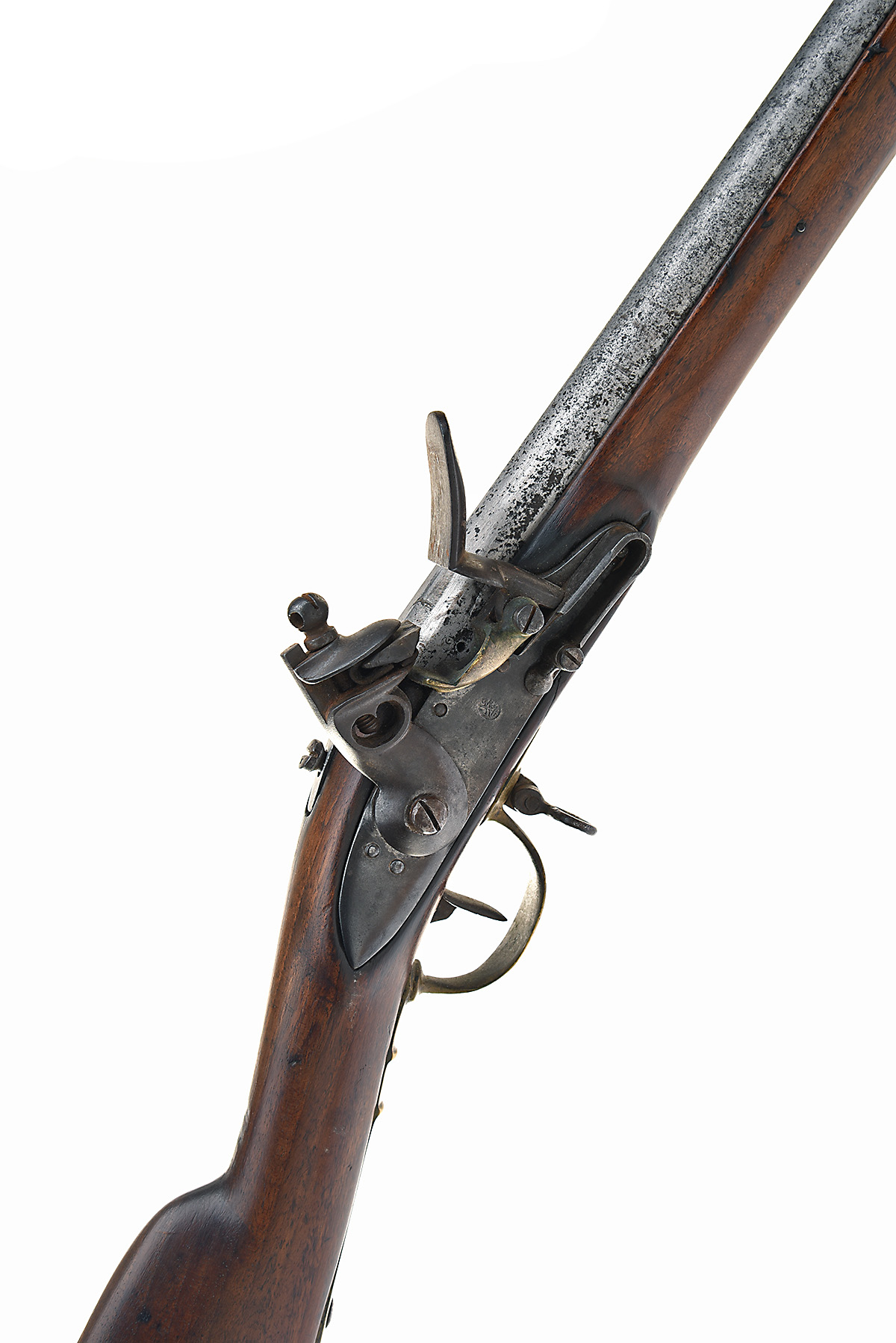 A .710 FLINTLOCK CHARVILLE MUSKET, no visible serial number, circa 1815, 40 1/4in. barrel, lock with brass pan and stamped with a Turkish or Egyptian tughra, walnut full-stock and brass furniture