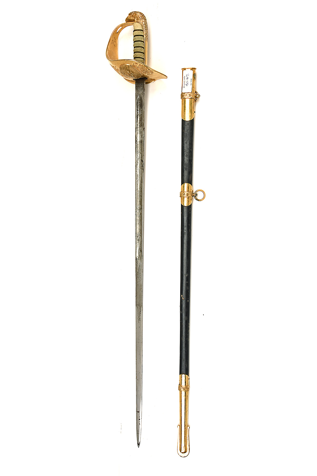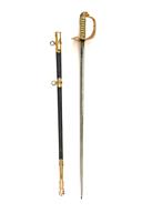A QEII RAF DRESS SWORD BY WILKINSON, numbered 116075, dating to 1983, with 32 1/2 in. blade etched on both sides with foliate ribbons, royal coat-of-arms to one side with crowned eagle over, ricasso marked with Wilkinson's maker details, hilt with gold plated pierced brass guard with royal cypher and crowned eagle, eagle head pommel, wire-bound white faux fish-skin grip, black leather scabbard with decorative gold plated furniture, blade with staining and rust spots, some grazing to the guard and slippage to the grip binding, scabbard leather with some grazing, and furniture with some losses to the plating and patches of tarnish, 39 in. overall length