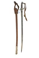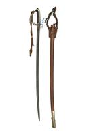 A BETTER VICTORIAN PATTERN 1822 LIGHT CAVALRY SWORD, circa mid-19th Century, with 35 in. single-edged slightly curved blade, floral etching on both sides together with crown and royal cypher, plus a phoenix over 'R. C. O.', ricasso with Wilkinson proved plug, steel hilt with wire-bound black fish-skin grip, brown leather sword knot, together with its brown leather field scabbard with steel chape and brown leather frog; blade stained, etching rubbed, hilt cleaned with no chequering on back-strap, grip worn with some small losses to the fish-skin, some grazing to the scabbard leather and rust spots to the chape; this appears to be a mid-century blade with a family crest and owner's initials with a restored or replacement hilt and an early 20th Century field scabbard