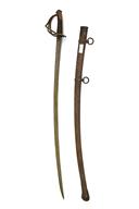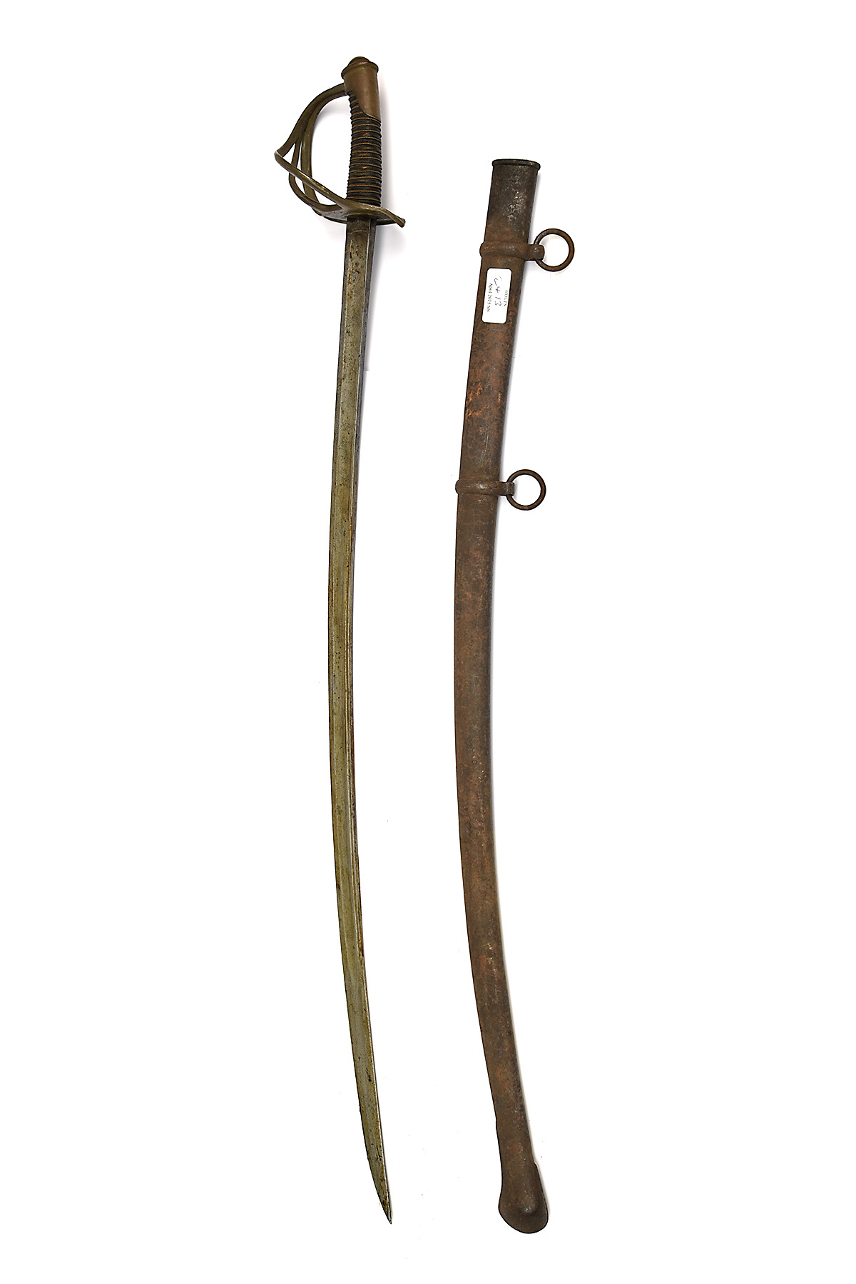 A UNITED STATES MODEL 1840 'WRIST-BREAKER' CAVALRY SABRE BY P D LUNESCHLOSS, mid-19th Century, with 36 in. single-edged curved blade fullered on each side, ricasso stamped 'PDL' for P D Luneschloss of Solingen, brass hilt, 3-barred guard, wire-bound leather grip, together with its steel scabbard with two suspension loops, worn, wire lifting from grip, scabbard rusted and pitted