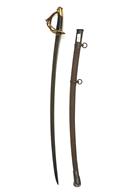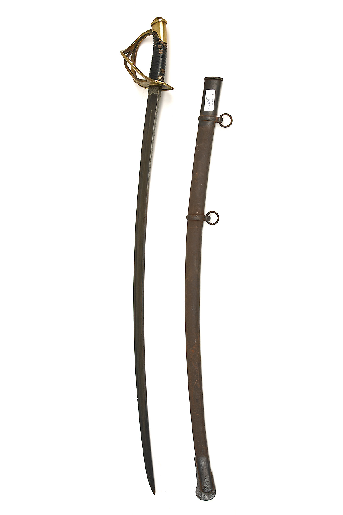 A FRENCH MODEL 1822 LIGHT CAVALRY SWORD, circa 1830s, with 36 in, single-edged curved steel blade fullered on each side, 3-barred cast brass hilt with wire bound leather grip, together with an associated steel scabbard with two suspension rings, worn, no visible markings, grip with losses to both the leather and wire, exposing the underlying wood, scabbard rusted and pitted, badly fitting with missing throat screw
