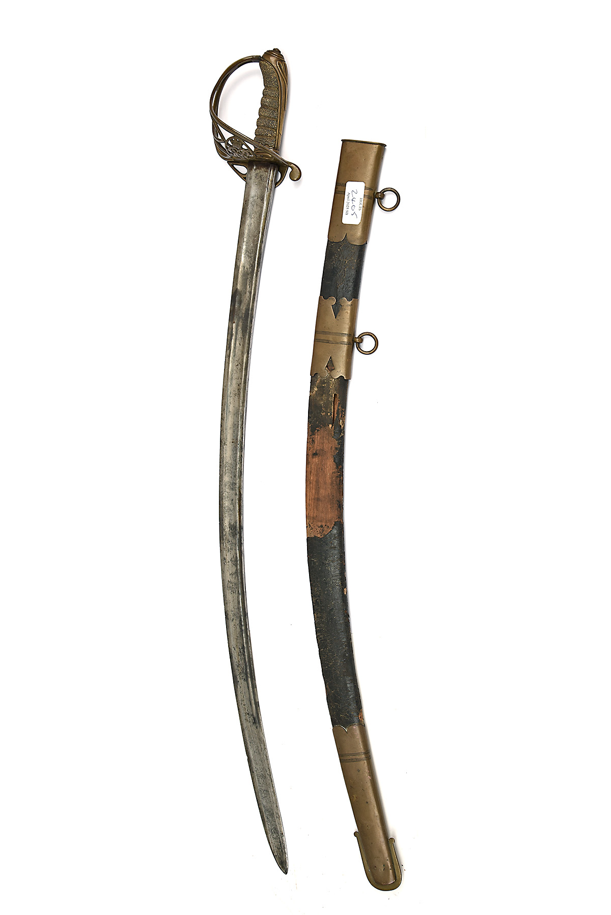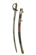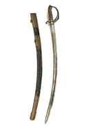 AN UNUSUAL WILLIAM IV OFFICER'S SWORD, circa 1830s, with a single-edged 32 in. curved blade fullered on each side attached to a Pattern 1822 gothic hilt with the royal cypher of William IV and folding guard, black fish-shin grip, together with it's black leather scabbard with brass fittings, this appears to be a P1822 hilt merged with an earlier blade, possibly from a Pattern 1803 Light Infantry Officer's Sword, blade heavily cleaned with traces of blinded pitting and leaving no engraving, edge nicks, guard dented, wire binding absent from grip, scabbard heavily worn with losses to the leather exposing large patches of the wooden liner which itself is cracked and split with small losses, furniture with shallow denting, some small losses to the liner