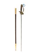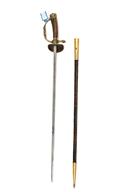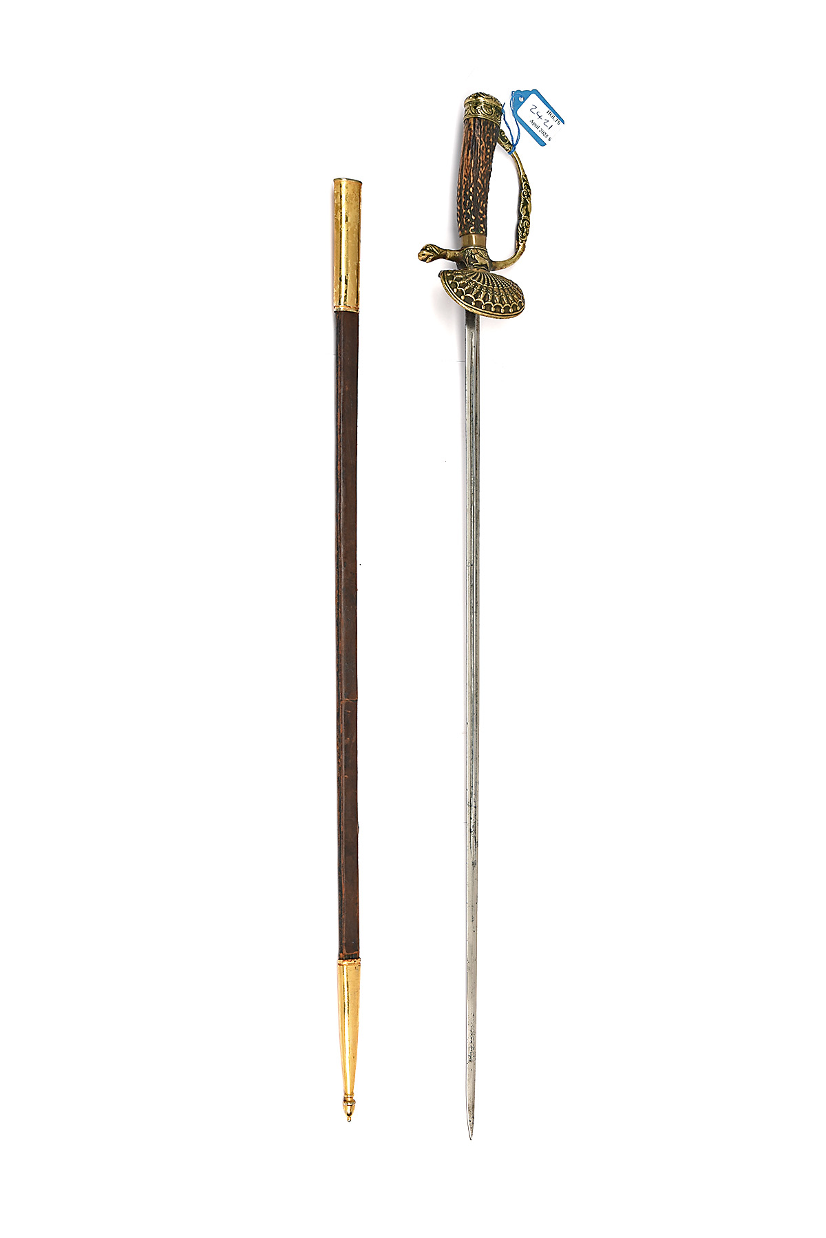 A BETTER GERMAN HUNTING SWORD, circa 1900, with 25 1/2 in. narrow steel blade with two fullers on each side, cast brass shell guard and hilt decorated with stylised hunting scenes, antler grip, together with its brown leather scabbard with brass fittings, blade cleaned bright, loss of definition to the hilt decoration, scabbard frog stud missing and grazing to the leather
