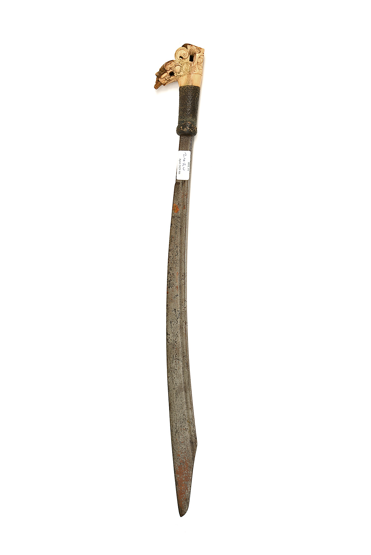 A BORNEO DYAK MANDAU 'HEADHUNTER'S' SWORD, circa 1900, with 24 in. single-edged blade with shallow narrow fuller on each side set in a bone handle with ornately carved pommel, blade with staining, blinded pitting and patches of surface rusting, pommel damaged with losses