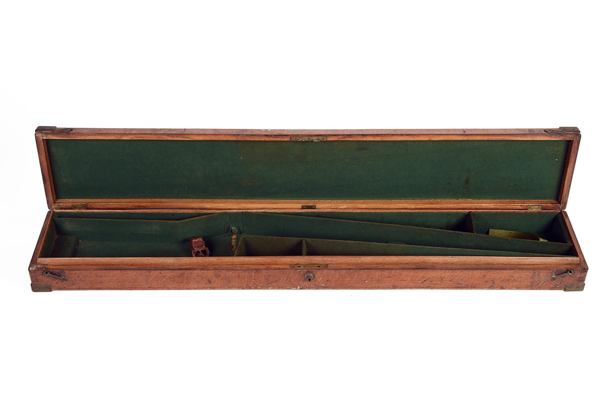 late 19th to early 20th century, lined and compartmented in green baize to take the rifle assembled, possibly for a bolt-action, measuring externally 47in. x 7 3/4in. x 3 1/2in., hook and lock closure, no key