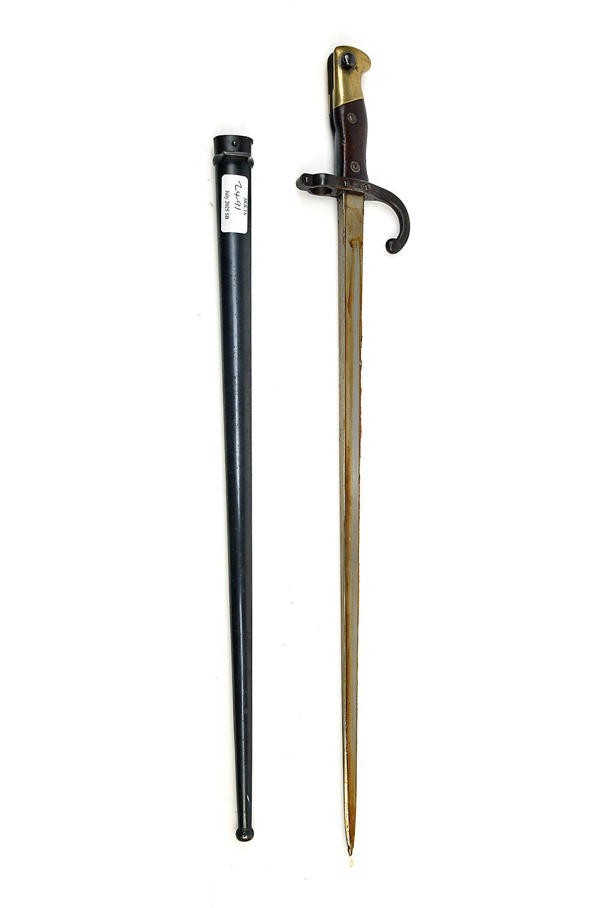 A GOOD FRENCH MODEL 1876 SWORD BAYONET FOR THE GRAZ RIFLE, dated 1876, with 20 1/2 in. single-edged blade with inspection marks, blade back engraved for St. Etienne Arsenal, quillioned cross-guard with inspection marks, wooden grips, brass pommel, with its black steel scabbard, matching serial numbers of 'G81252', clear marks and engraving
