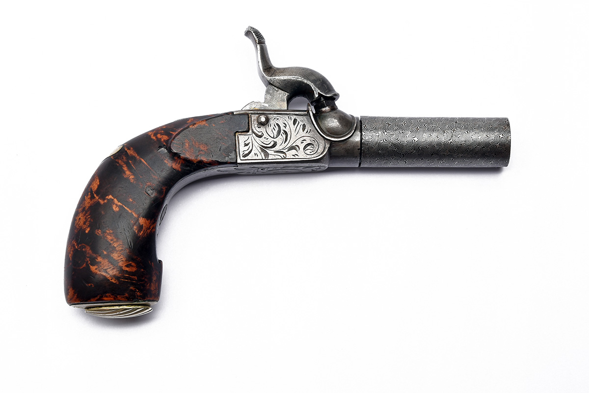 A 40-BORE PERCUSSION MICRO-RIFLED MUFF-PISTOL, UNSIGNED, no visible serial number, in a later case, with turn-off etched damascus 2in. barrel, engraved boxlock action with central hammer and concealed automatic trigger, burr wood grip with white metal trap at heel, in a later wood box
