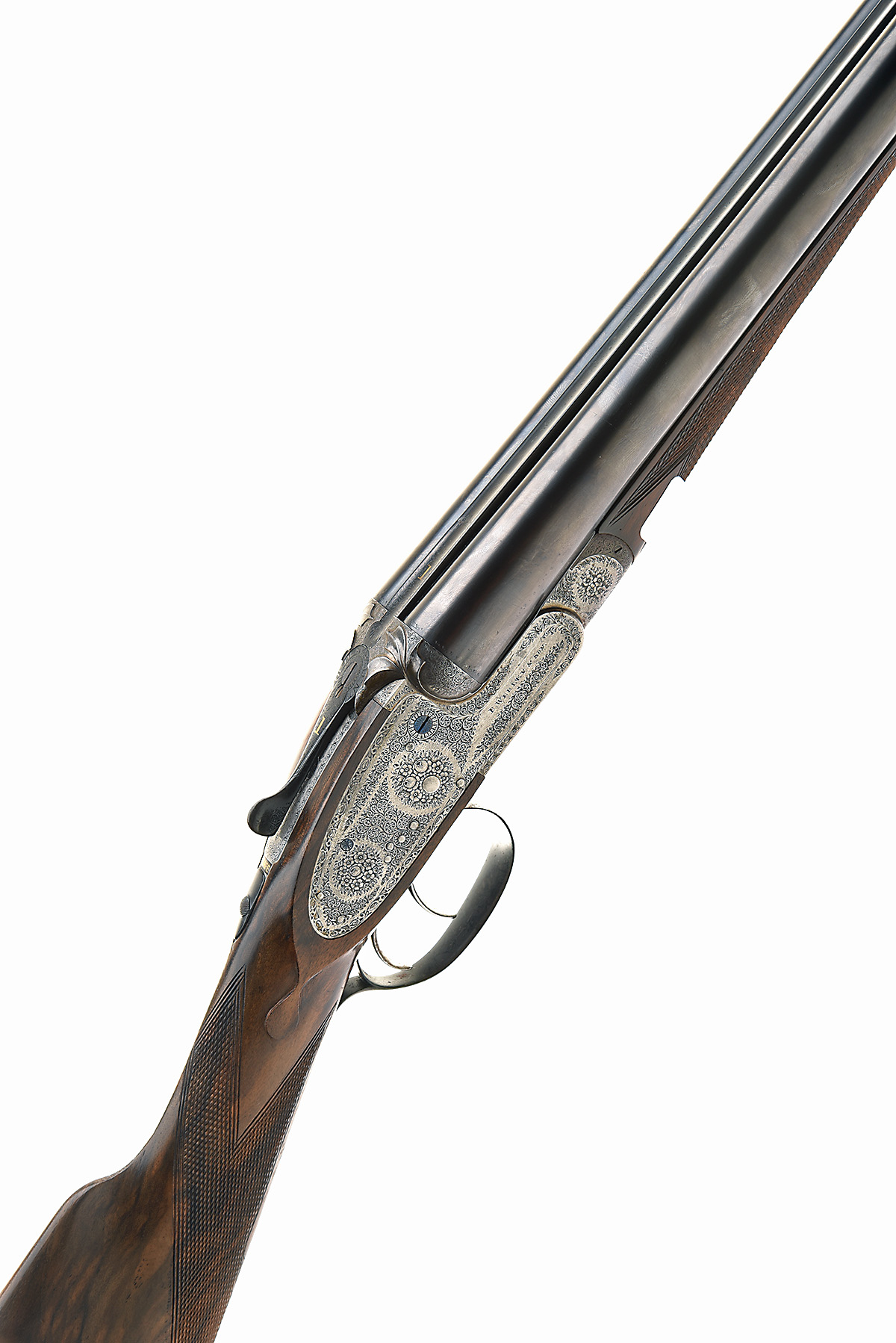 P. WEBLEY & SON 12-BORE SIDELOCK EJECTOR, serial no. 51947, circa 1900, 28in. sleeved nitro barrels, rib engraved 'P. WEBLEY & SON. 78. SHAFTESBURY AVENUE. LONDON.', 2 1/2in. chambers, bored approx. 1/4 and 3/4 choke, treble-grip action with carved stylised acanthus leaf fences, toplever gold-inlaid '1', automatic safety with gold-inlaid 'SAFE' detail, border and acanthus scroll engraving with floral bouquets, brushed finish, 15in. figured replacement stock, weight 6lb. 8oz.