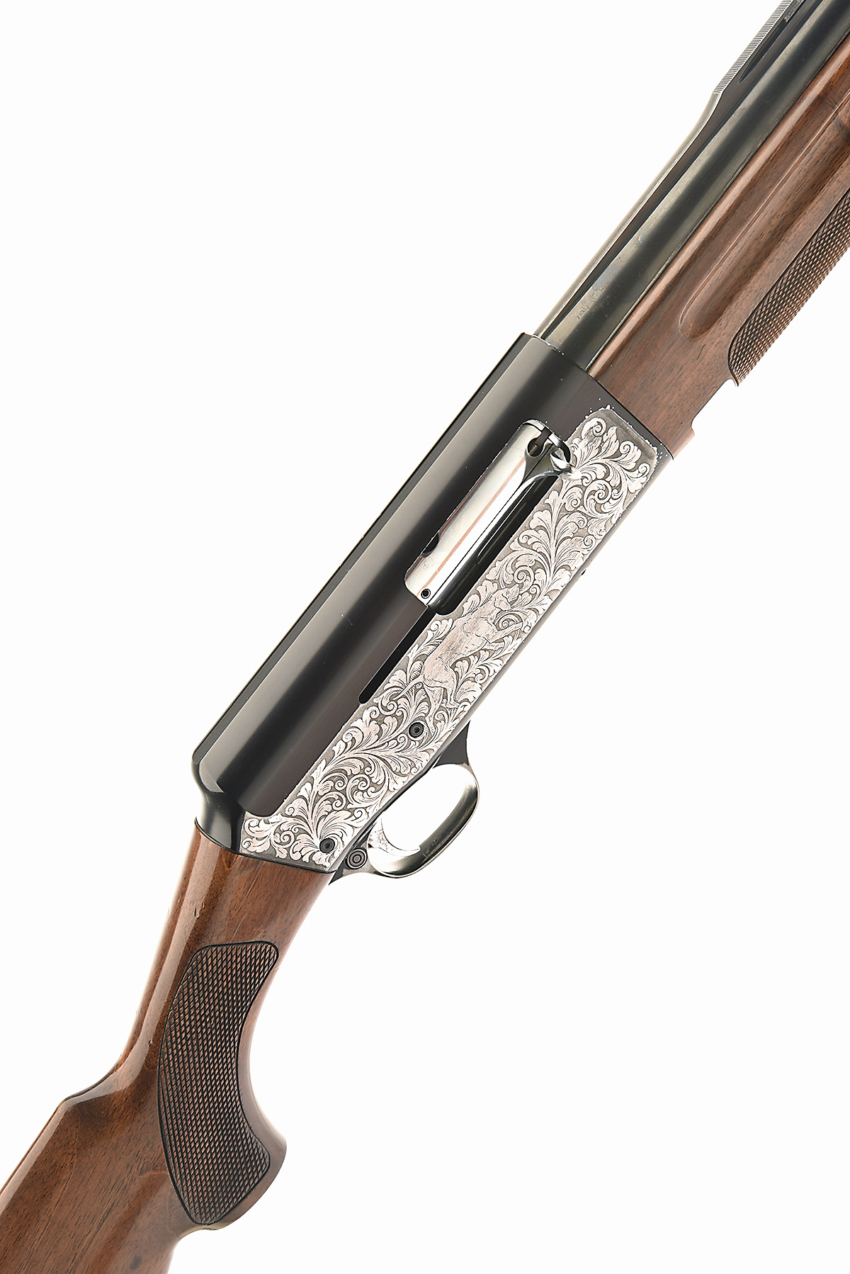 S.P.A. LUIGI FRANCHI 12-BORE 'MODEL 48/AL' SEMI-AUTO SHOTGUN, serial no. D57304, for 1974, restricted magazine, 28in. nitro barrel with 6mm raised ventilated matt rib, 2 3/4in. chamber, bored approx. 3/4 choke, barrel numbered DNA0740, manual push-button safety, blacked action with silver die panels engraved with acanthus scroll and dogs on point, 14in. pistolgrip stock including trademark buttplate