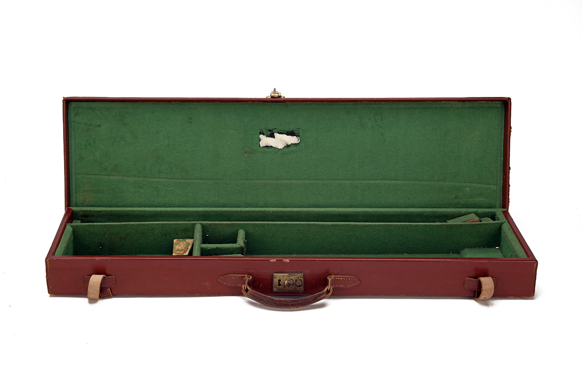 A LEATHER SINGLE GUNCASE, fitted for 30in. barrels, the interior lined with green baize, trade label removed, brass lock (key missing)