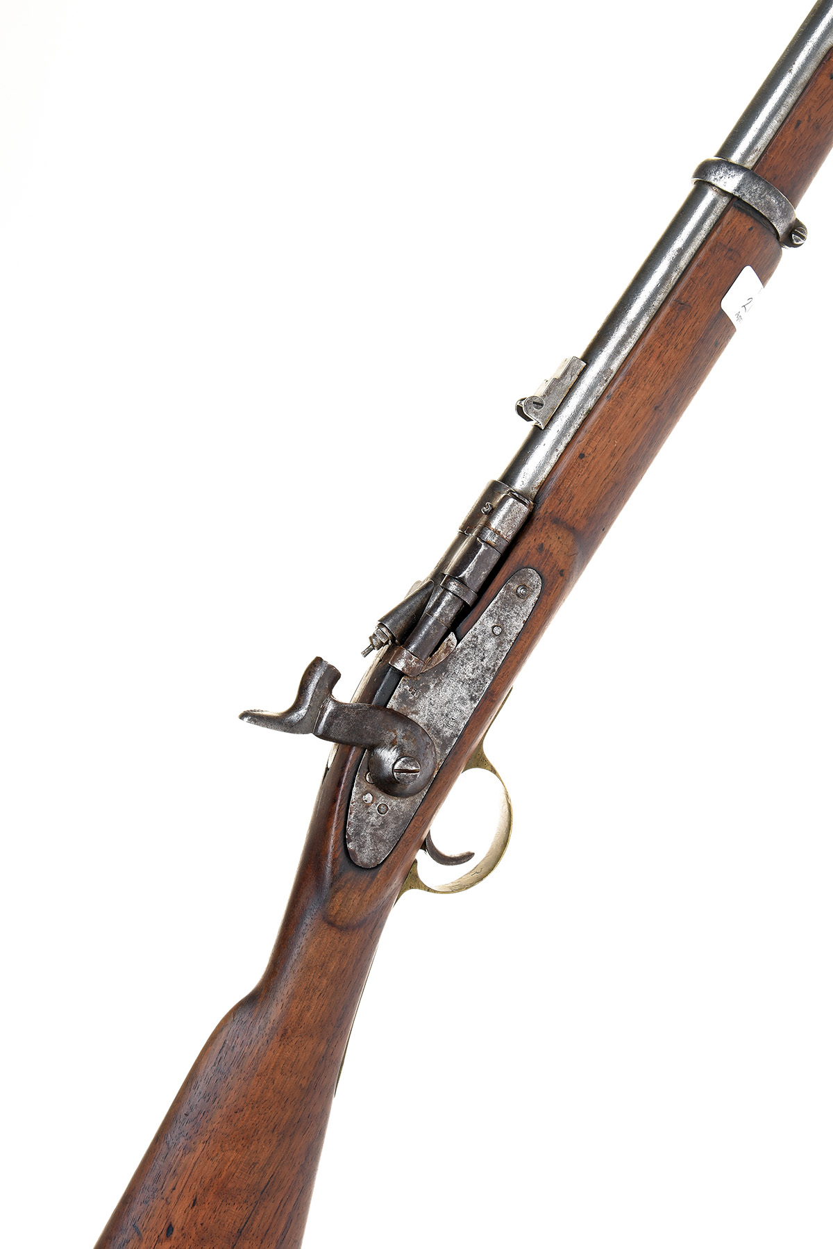 * A .577 SNIDER CARBINE, serial no. L13G, Belgian manufacture, with sighted 19in. barrel, flip-open breech, lock with added registration number and walnut half-stock with brass furniture, single iron barrel-band and no provision for clearing rod, finish worn