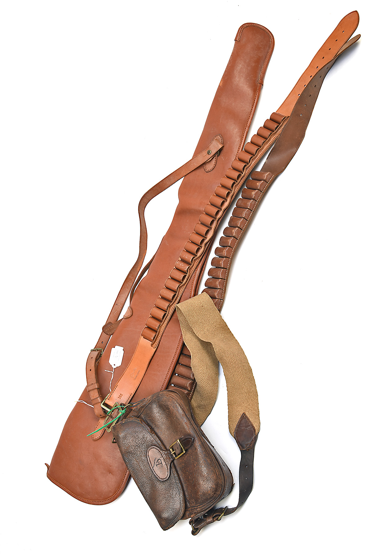 A SELECTION OF SHOOTING RELATED ITEMS, comprising of a Brady leather fleece-lined single gunslip, cartridge bag, 2 x leather 12-bore cartridge belts