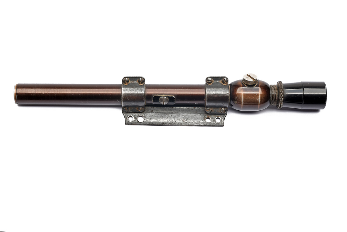 A VINTAGE TELESCOPIC RIFLE SIGHT, circa 1950s, with graticule, clear optics and working focus, marked 'PROV. PAT. / 5928-53' and 'No. 1474', no maker's details, with mount, 11 in. length