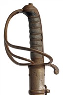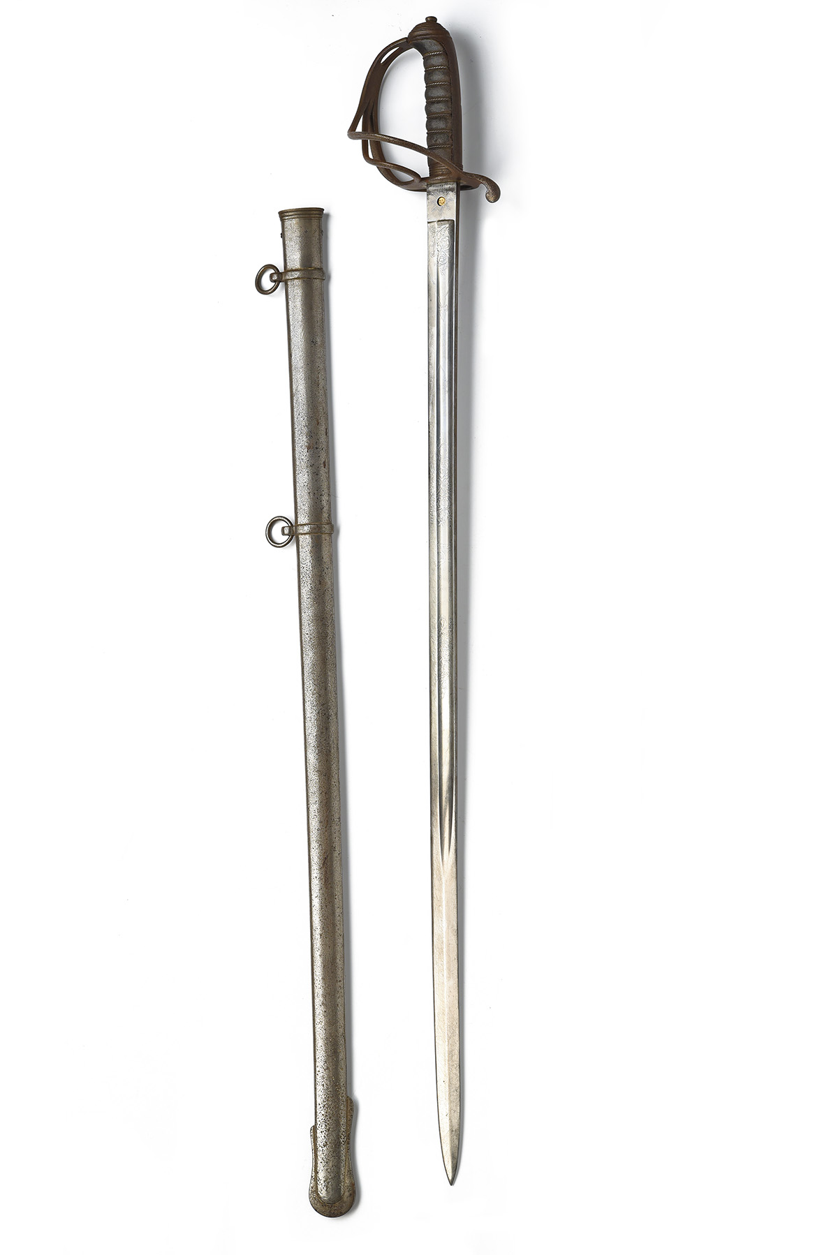A PATTERN 1821 VICTORIAN LIGHT CAVALRY OFFICER'S SWORD FOR THE BRISTOL VOLUNTEER ARTILLERY, circa 1860, with 32 3/4 in. single-edged blade fullered on each side, etched with scroll-work and queen's crown and royal cypher to one side and 'BRISTOL / VOLUNTEER / ARTILLERY' and fieldgun over, ricasso marked 'GEo. GIBBS / BRISTOL / GUN & SWORD / MAKER', 3-barred guard, bound fishskin grip, with its steel scabbard with two suspension rings, blade crudely sharpened leaving grazes and removing the etching from the leading edge, hilt worn with rust and blinded pitting to the guard, scabbard dented with heavy blinded pitting