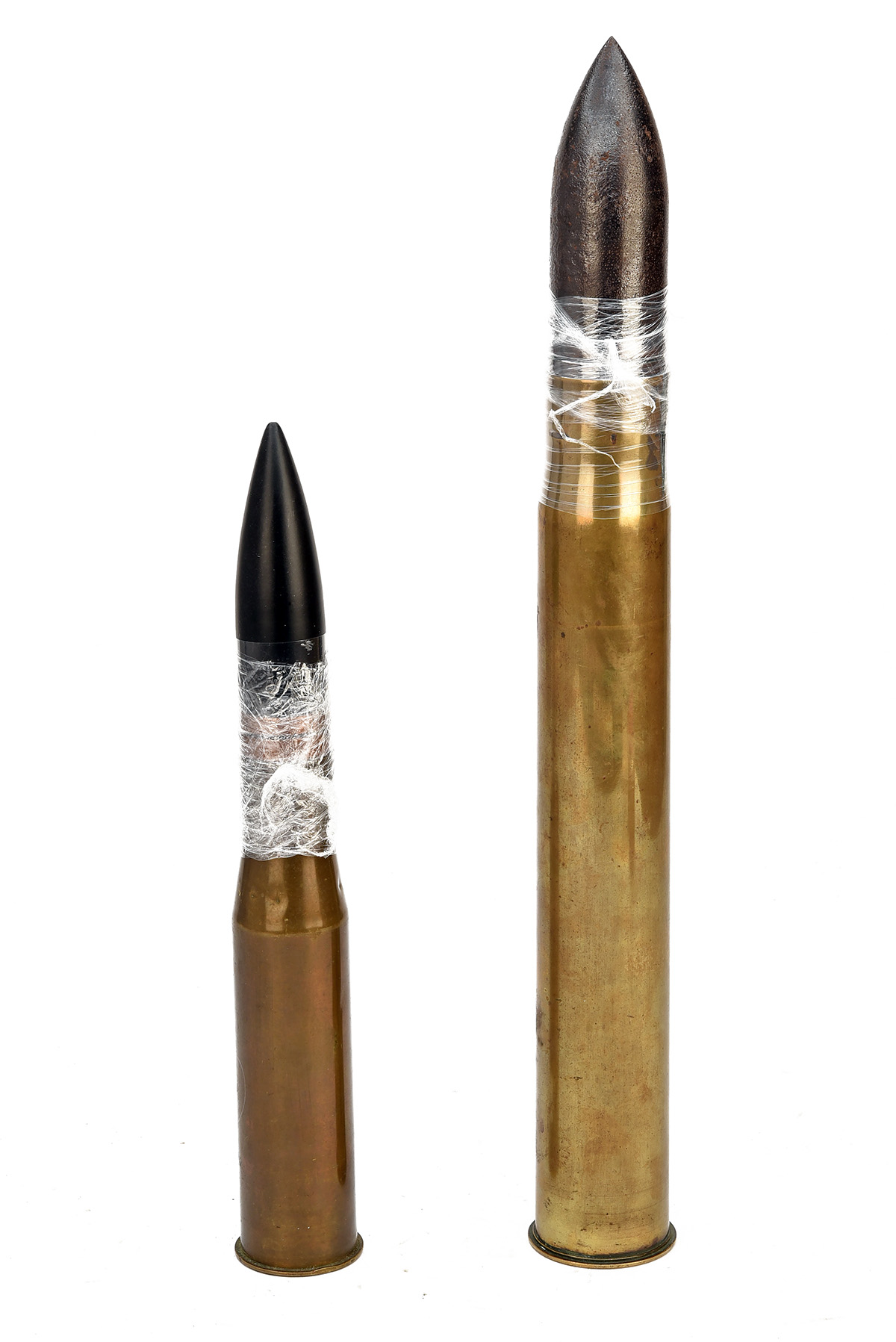 A PAIR OF BETTER SHELL CASES, being 1) a Royal Navy Boer War period 6 pdr Hotchkiss case, dated 12 1896, with fired fuze and head, split to neck, 20 in. height; 2) a WWII 37mm case with fuze dated 1937, reproduction resin head, 14 in, height (2)