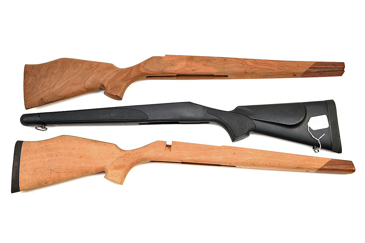 THREE 'REMINGTON' RIFLE STOCKS, 1 bolt action unfinished wood stock wit recoil pad, 1 unfinished wood stock, 1 polymer stock with recoil pad and sling swivels (3)