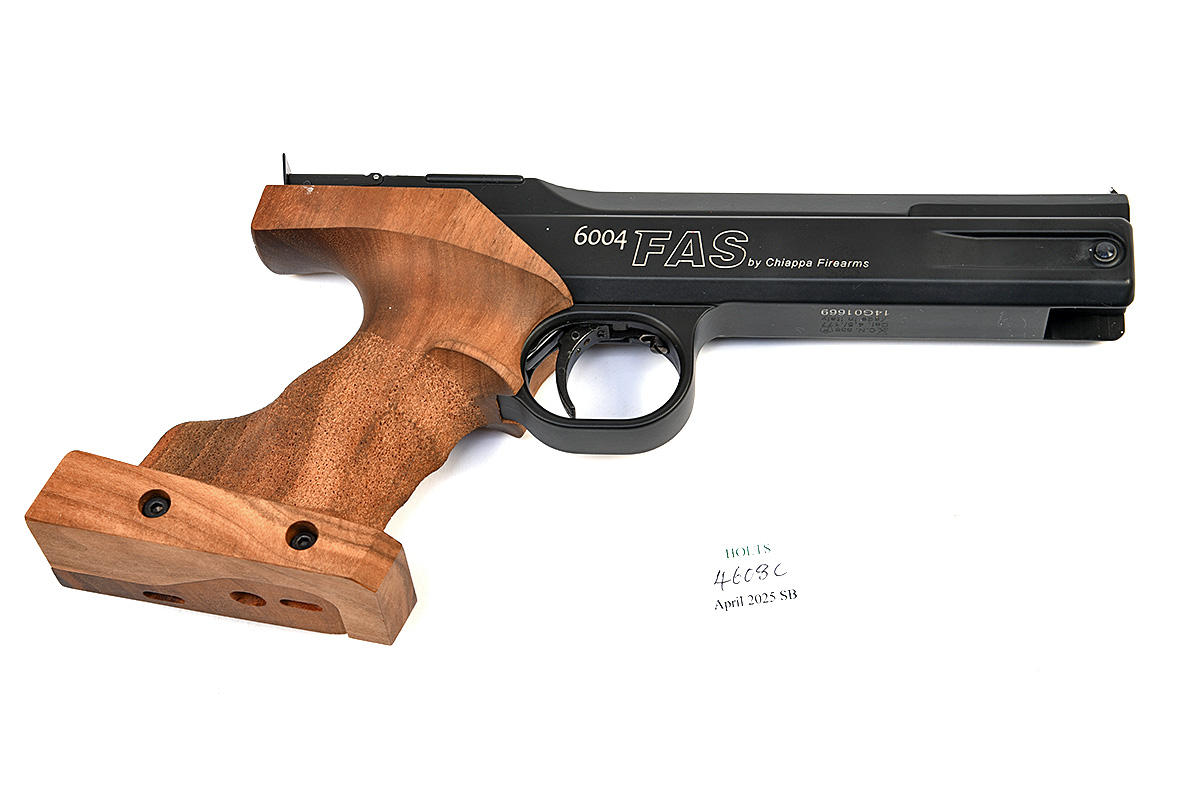 A CASED ,177 FAS 6004 SINGLE-STROKE PNEUMATIC TARGET AIR PISTOL, serial no. 14G01669, with shrouded 8in. barrel, adjustable sights. blacked alloy receiver and anatomical right hand walnut grip, appearing little used in its maker's abs plastic carry-case with accessories