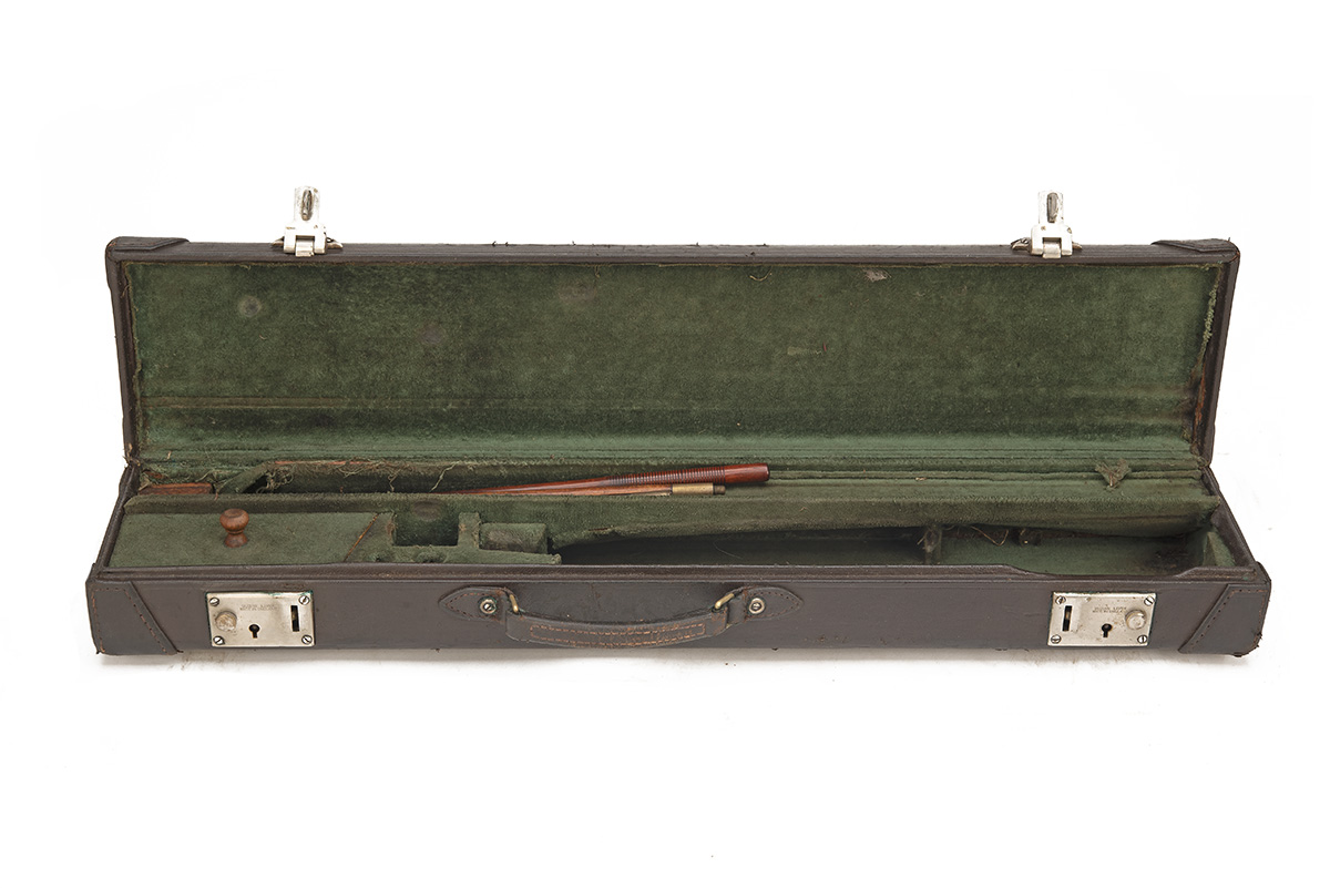 A LEATHER LIGHTWEIGHT SINGLE GUNCASE, fitted for 28in. barrels, the interior r lined with green baize, two locks (keys missing), the lid exterior marked 'J.K.M'