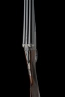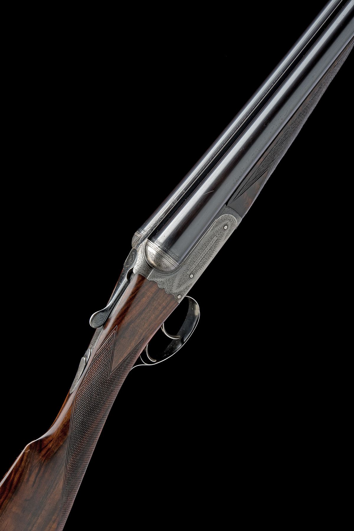 circa 1910, 28 1/4in. nitro reproved barrels (in 1983), the rib engraved 'JAMES MACNAUGHTON & SONS. 36 HANOVER STREET. EDINBURGH.', the breech end engraved '2' and with acanthus scroll detailing, 2 1/2in. chambers, bored approx. 1/4 and 1/2 choke, scroll-backed treble-grip action, toplever engraved '2', automatic safety with engraved 'SAFE' detail, fine border and acanthus scroll engraving surrounding the makers name in a banner, retaining very slight traces of original colour-hardening and finish, 15 1/2in. figured replacement stock, sculpted fore-end finial engraved '2', weight 6lb. 10oz.