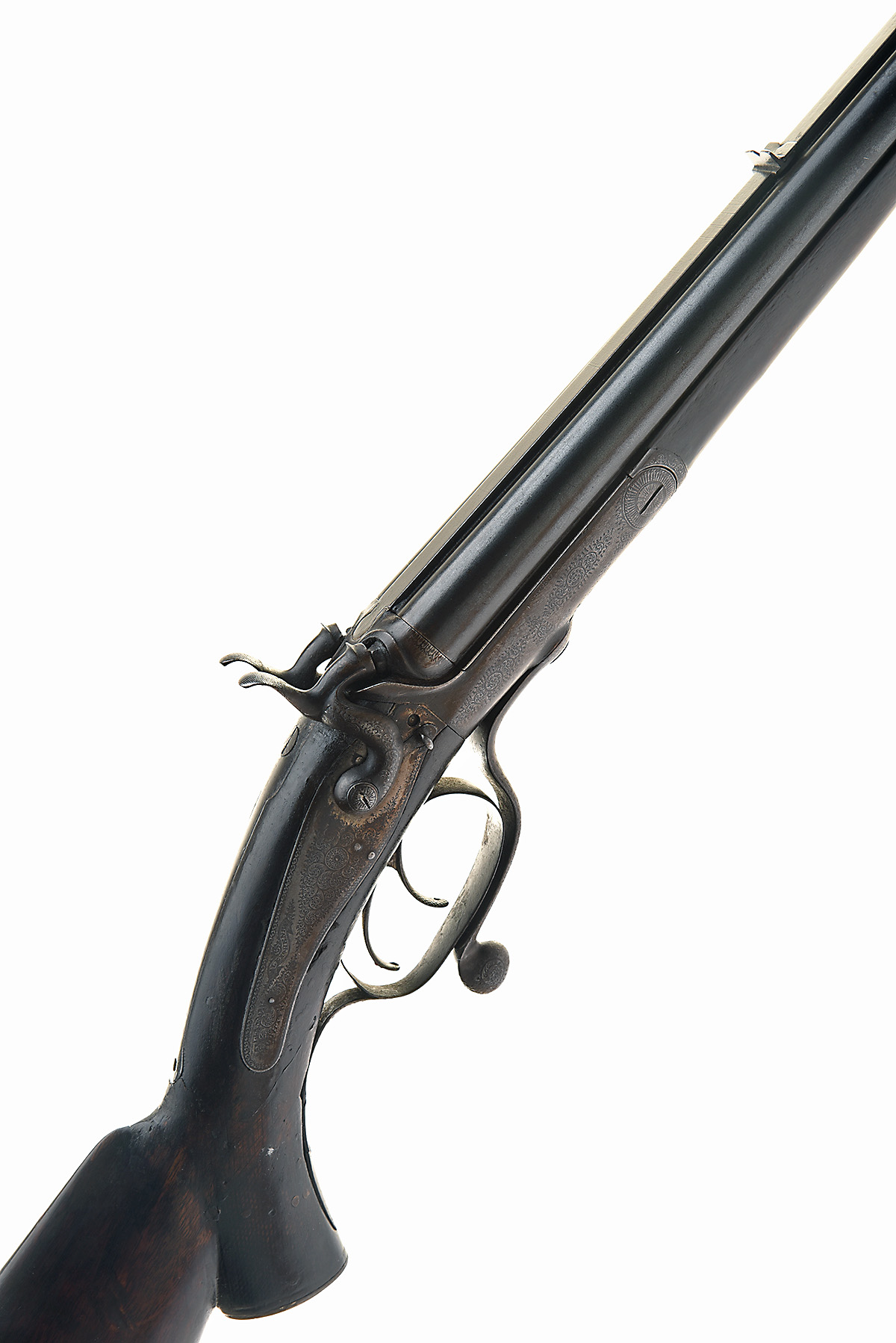 A .450 (BPE) ALEXANDER HENRY DOUBLE-BARRELLED HAMMER SPORTING RIFLE, serial no. 5360, for 1882, with sighted 28in. barrels, swing under-lever action, back-action rebounding locks with bolted safes, walnut pistol-grip butt-stock (cracked and repaired at wrist) and splinter fore-end