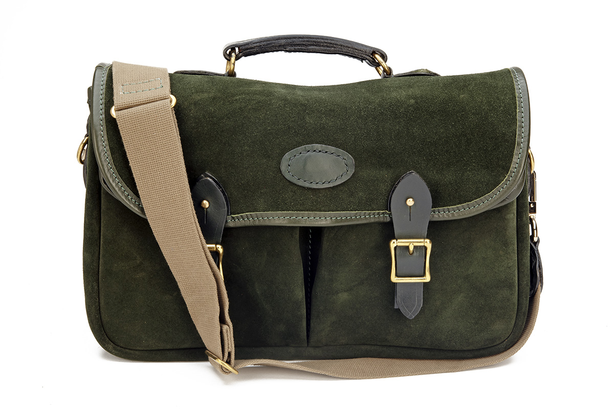 with green leather handle and edging, two front pockets with stud fasteners, main flap with brass buckles with buckle or stud opening option, full length zipper pocket to the rear, internally lined in brown nubuck, the underside with leather 'Jo Yorath Luxury Leather Made in England' signature patch