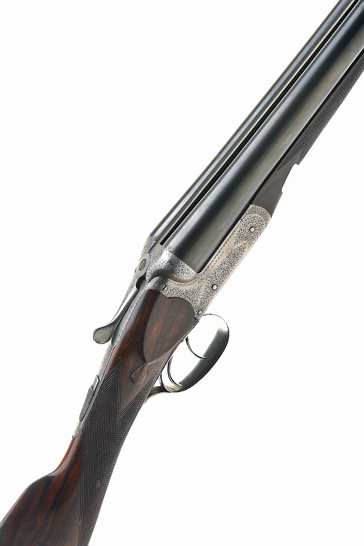HANSON 12-BORE BOXLOCK EJECTOR, serial no. 3742, serial number on fore-end loop only, 26in. sleeved nitro barrels, 2 1/2in. chambers, bored approx. 1/4 and 1/2 choke, scoop-back treble-grip action, automatic safety, intercepting sears, automatic safety, border and partial scroll engraving, 14 3/4in. stock, weight 6lb. 9oz.