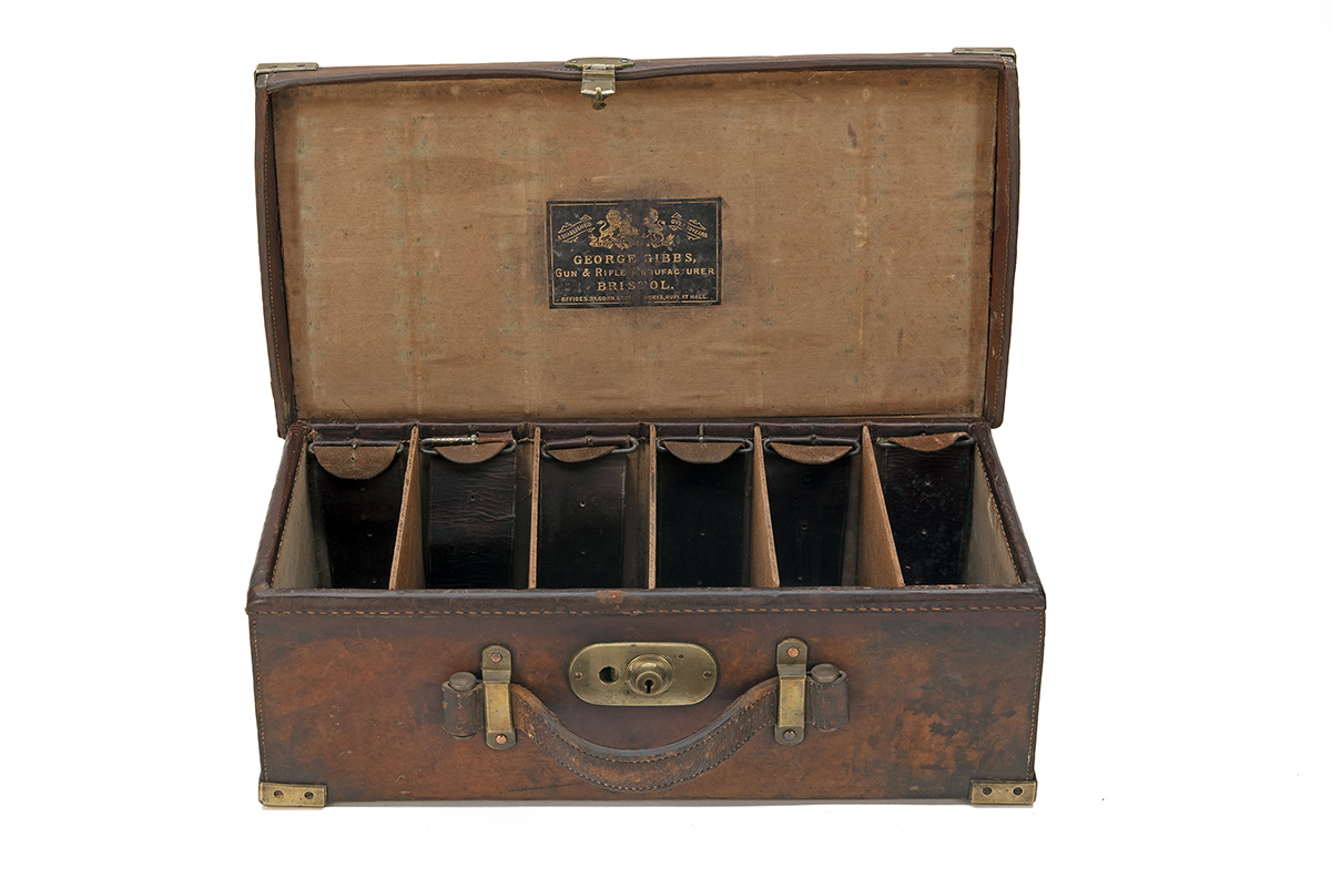 for approx. 300 cartridges, canvas lined interior, a George Gibbs trade label, brass lock (key missing), the lid exterior marked 'H.W.H.'
