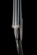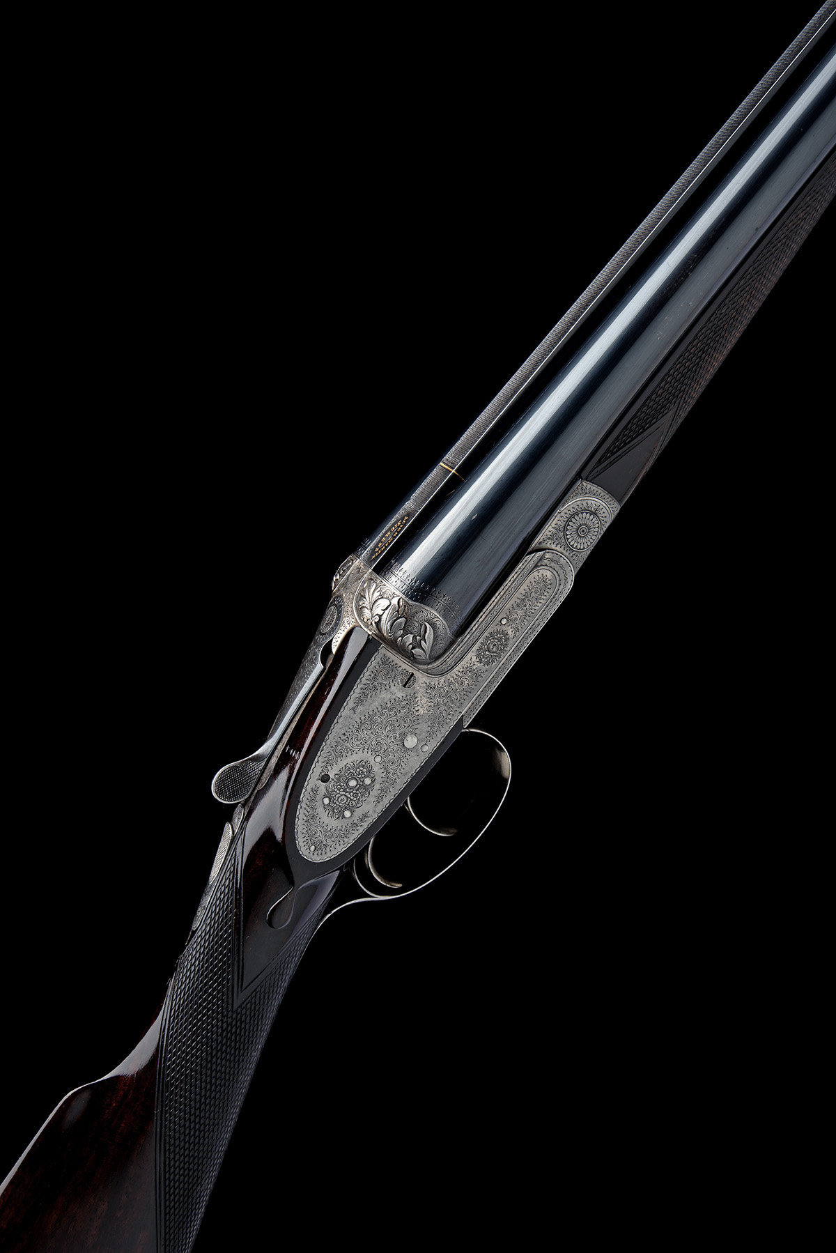 circa 1915, 27 1/2in. nitro reproved barrels, matt rib gold-inlaid 'ACIER MARTIN SIEMENS' at the breech end, 2 3/4in. chambers, bored approx. imp. cyl. and 1/4 choke, bolstered treble-grip action with hidden third bite and sideclips, fences carved with bold foliate work on an acanthus background, manual safety, articulated front trigger, border and acanthus scroll engraving with floral bouquets, brushed finish, 14in. stock including 3/4in. leather-covered recoil pad, weight 7lb. 5oz.