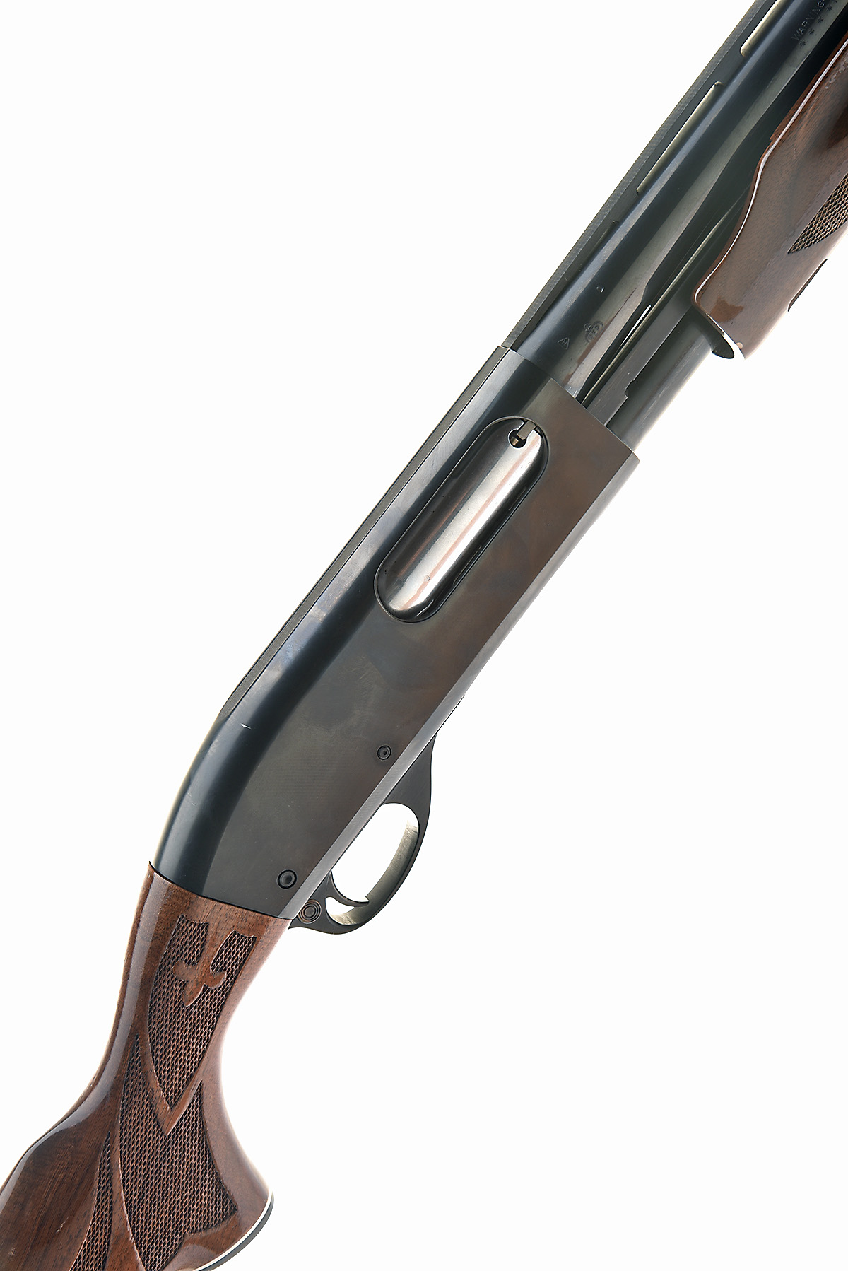 REMINGTON 12-BORE (3IN.) 'MODEL 870 MAGNUM' PUMP-ACTION SHOTGUN, serial no. W406010M, for 1985, restricted magazine, 25 1/2in. nitro barrel with 8mm ventilated matt rib, 3in. chamber, multichoke (no spares), manual push-button safety, plain blacked action, 14in. ornately chequered pistolgrip stock including ventilated rubber recoil pad, weight 7lb. 8oz.