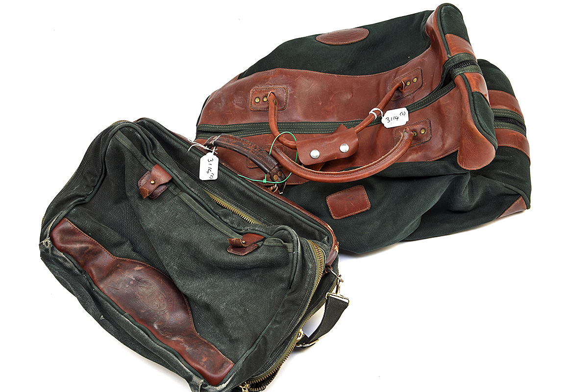 TWO ORVIS BATTENKILL GREEN CANVAS AND LEATHER TRAVEL HOLDALLS, (2)