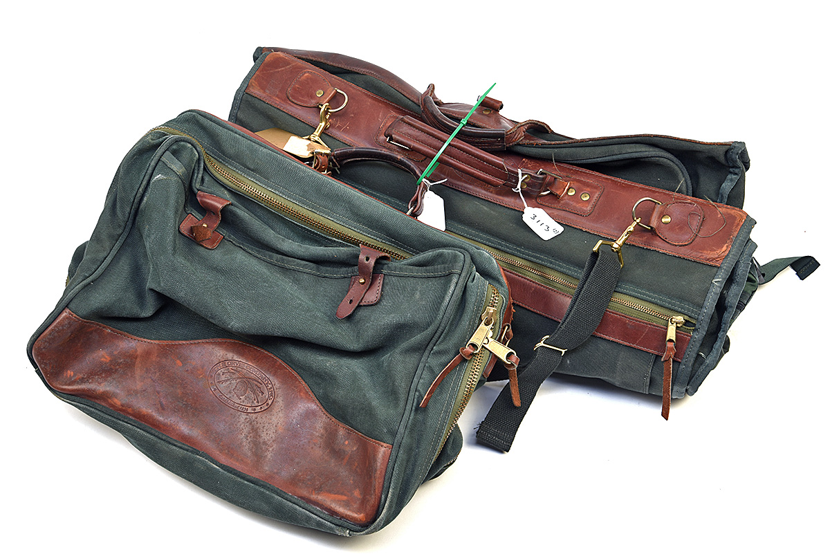 A ORVIS BATTENKILL GREEN CANVAS AND LEATHER GARMENT BAG AND LUGGAGE HOLDALL, (2)