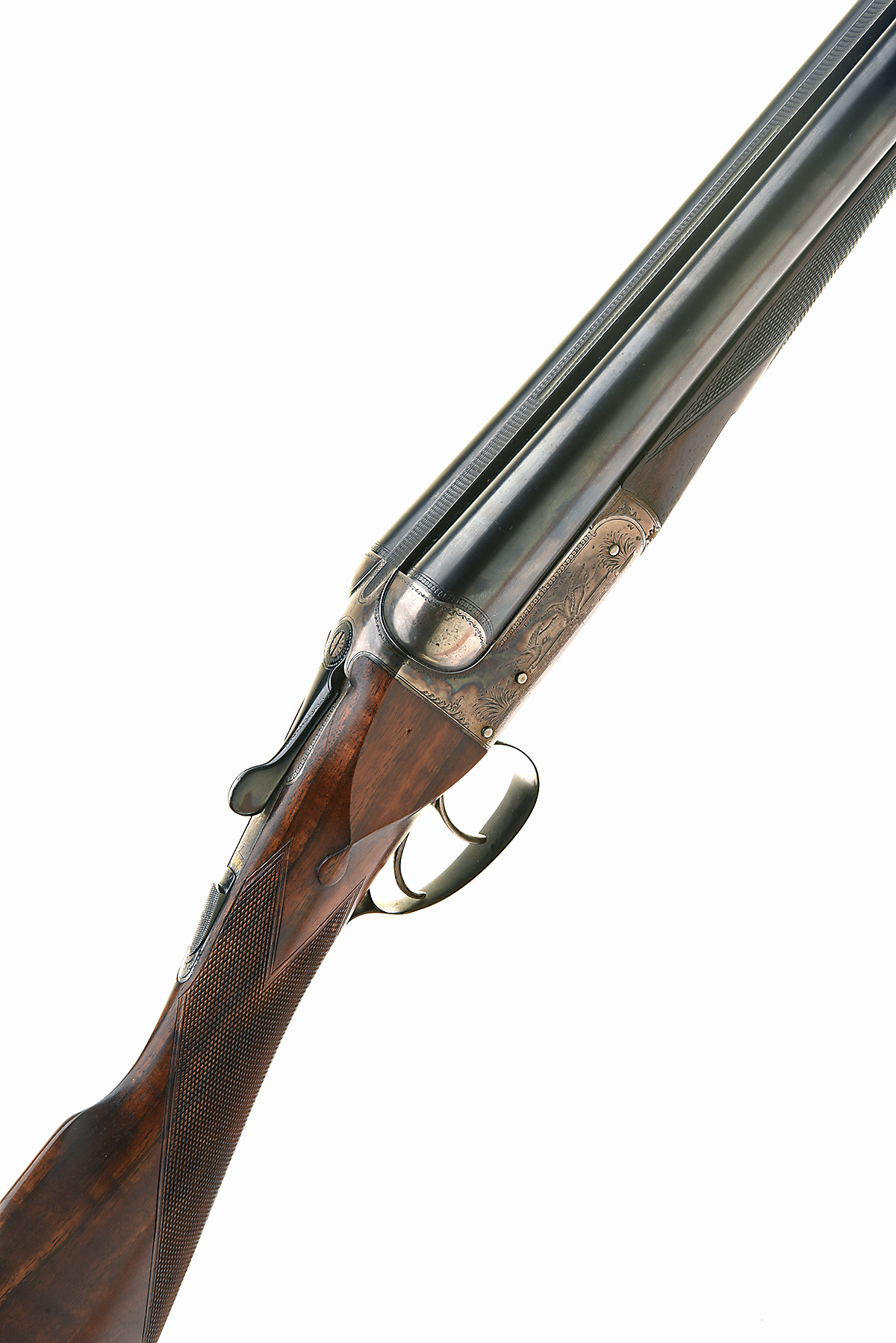 G.E. LEWIS & SONS 12-BORE (3IN. MAG.) BOXLOCK EJECTOR HEAVY WILDFOWLING GUN, serial no. 14213, for 1920, 32in. nitro reproved barrels (in1969), engine-turned matt rib engraved 'G.E. LEWIS & SONS. 32 & 33. LOWER LOVEDAY ST. BIRMINGHAM.', 3in. chambers, bored approx. full choke in both, large treble-grip action with sideclips, automatic safety with gold-inlaid 'SAFE' detail, engraved with beaded and scrollwork bordering surrounding scenes of ducks alighting from a wetland setting on each side, retaining slight traces of colour-hardening and finish, 15 1/2in. figured replacement stock with rubber recoil pad, fore-end with Deeley & Edge release catch and horn finial, weight 8lb. 12oz.