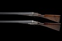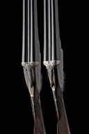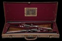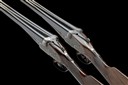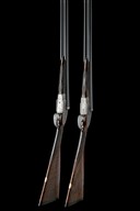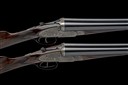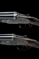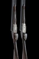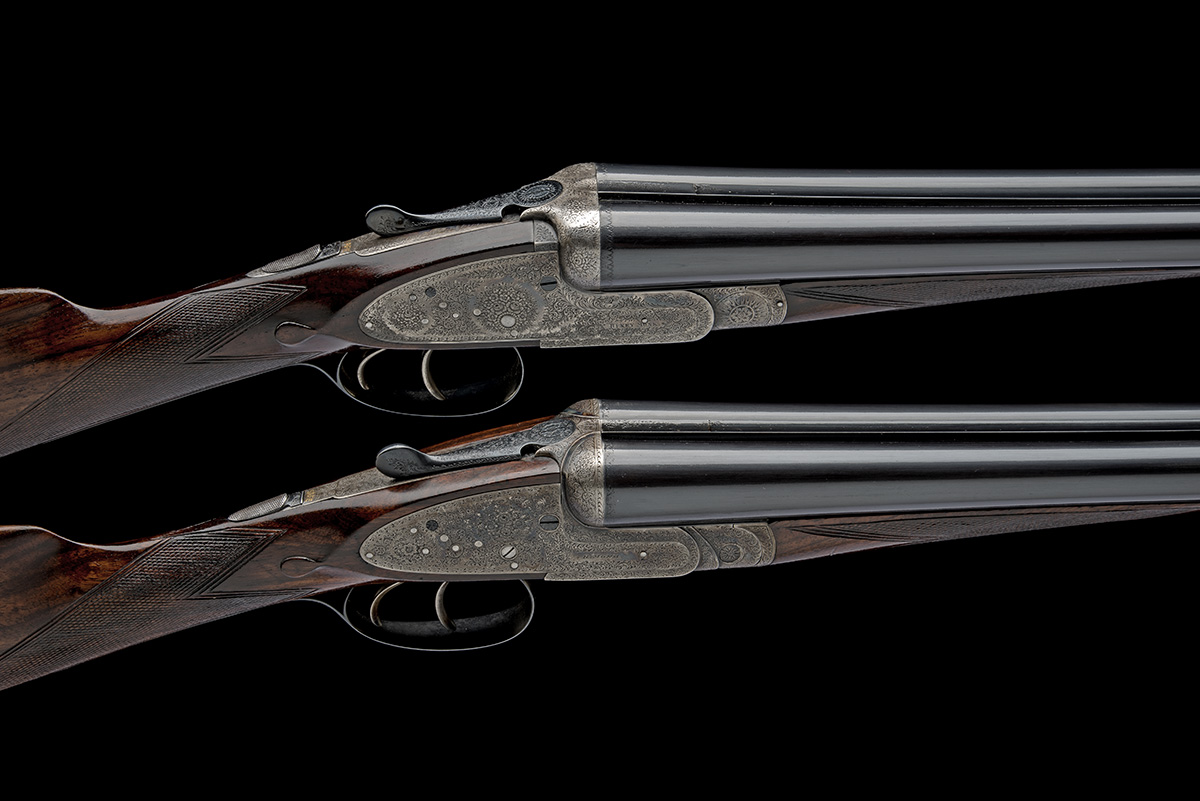 A COMPOSED PAIR OF HENRY MONK 12-BORE SIDELOCK EJECTORS, serial no. 19246 / 1924, circa 1934, 28in. nitro reproved barrels (No.1), 29in. nitro reproved barrels (No.2), ribs engraved '1' and '2', 2 1/2in. chambers, bored approx. imp. cyl. and 1/4 choke, treble-grip actions with hidden third bites, automatic safeties with gold-inlaid 'SAFE' details, border and acanthus scroll engraving with floral bouquets, retaining traces of original colour-hardening and finish, 14 1/4in. stocks including 1/2in. extensions, weight 6lb. 5oz. (No.1) 6lb. 7oz. (No.2), in their makers brass-cornered leather double guncase