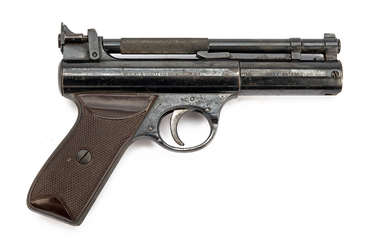 A .22 WEBLEY & SCOTT SENIOR AIR-PISTOL , batch no. 280, circa 1965, with blued 6 5/8in. barrel, blued and stepped air-chamber, three-pin trigger unit and chequered brown bakelite grips, much factory finish remaining.