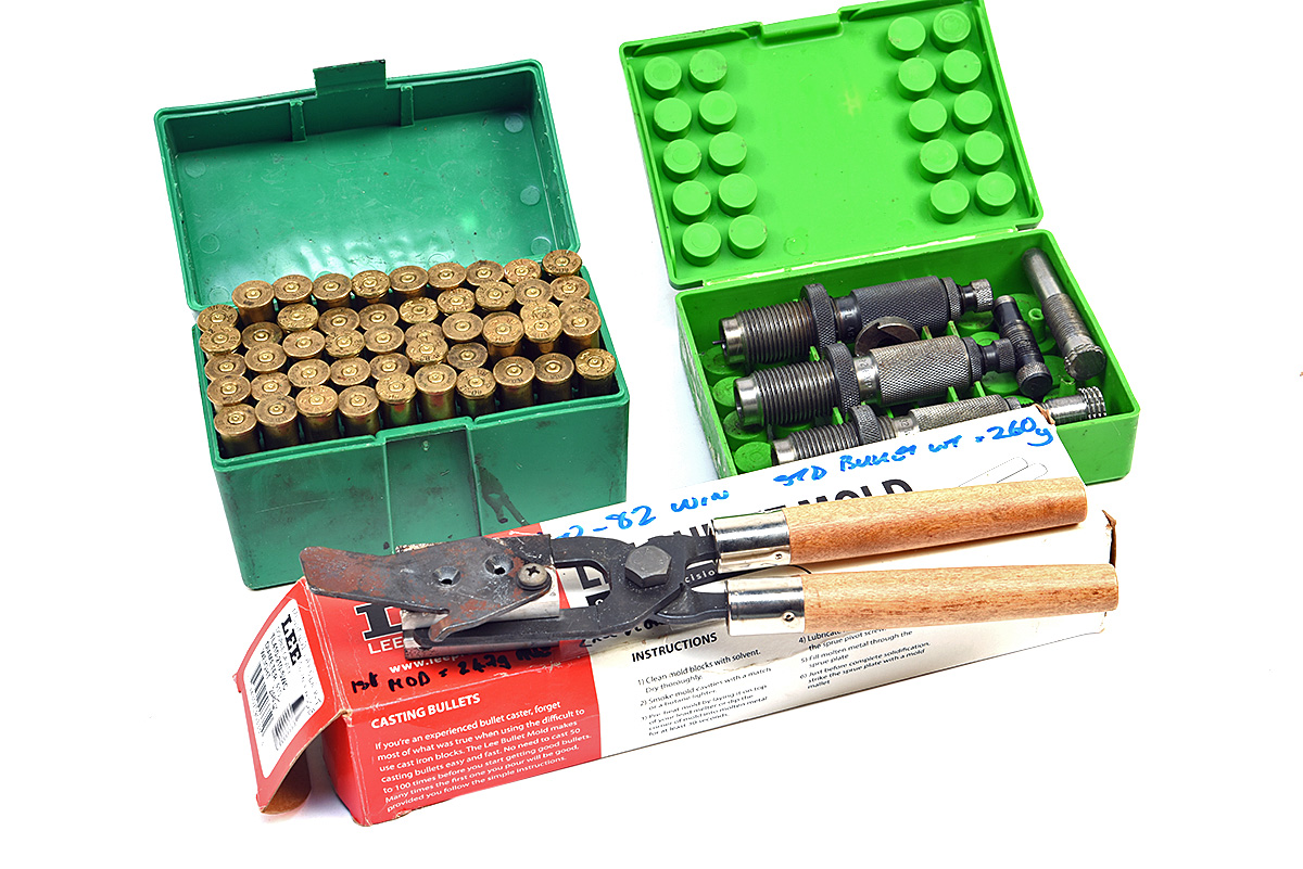 A 'REDDING' DIE SET, 'LEE' BULLET MOULD AND BRASS CASES FOR 40-83 WINCHESTER, 'REDDDING' 3 piece die set in case, 'LEE' double cavity bullet mould in box, 50 spend brass cases in box, 19 unused 'BERTRAM' brass cases in box (4)