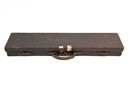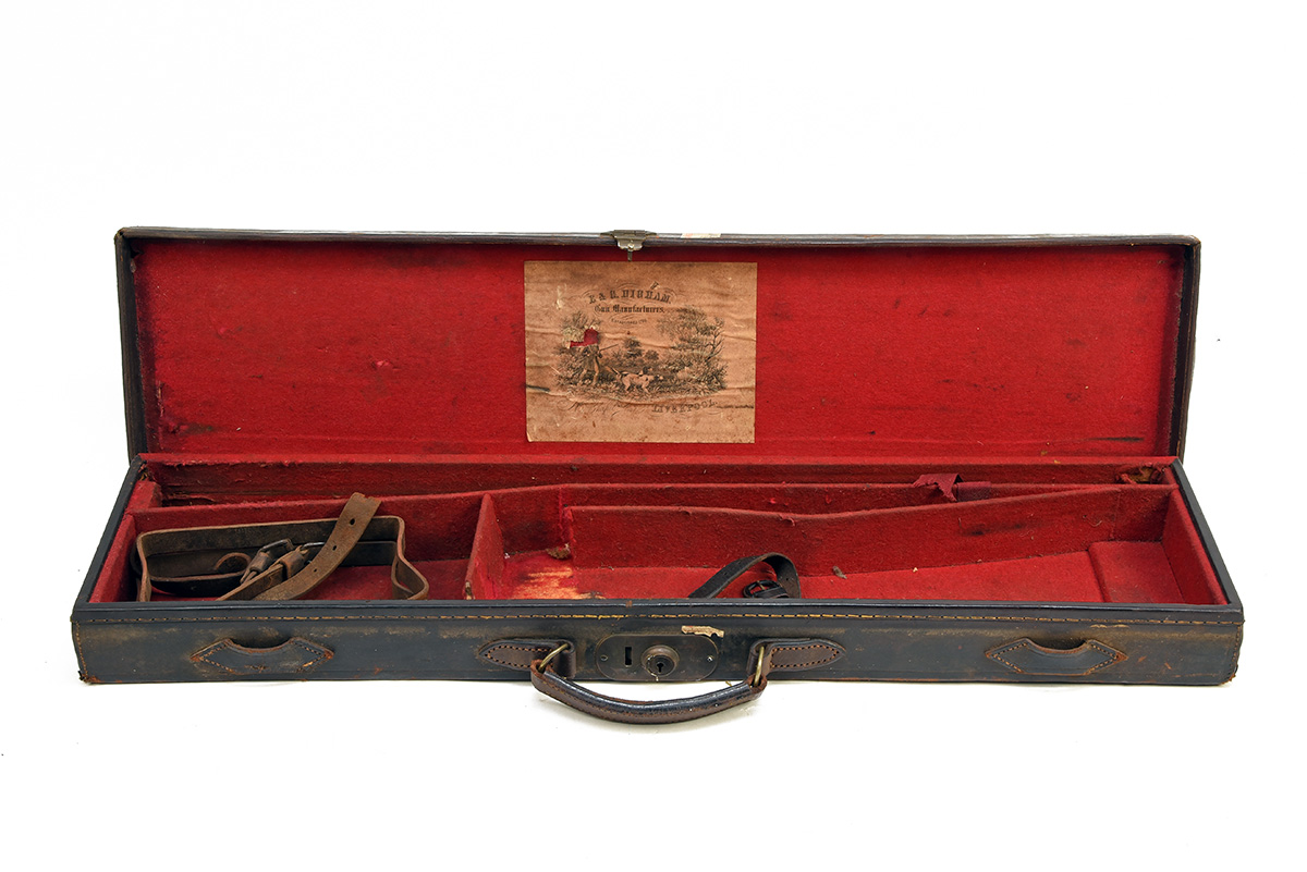 A 'E & G HIGHAM' LEATHER SINGLE GUNCASE, fitted for 30in. barrels, the interior lined with red baize, a 'E & G HIGHAM', trade label, lid initials 'G.K.Mc. C', brass lock (key missing)