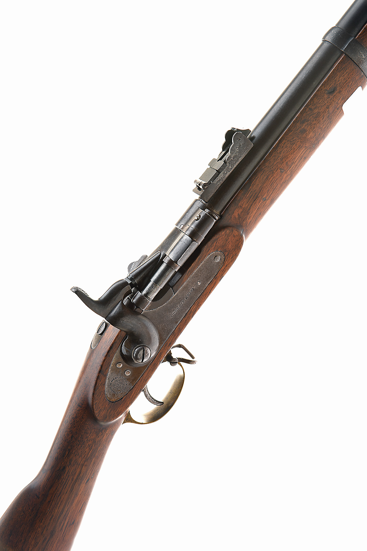 A .577 (SNIDER) THREE-BAND VOLUNTEER SNIDER RIFLE SIGNED ISAAC HOLLIS & SONS, no visible serial number, circa 1870, with 36 3/4in. sighted barrel, flip-open breech with sprung thumb-catch, plain signed lock with 'MAKER'S TO HER MAJESTY'S WAR DEPARTMENT' roundel at tail and walnut full-stock with brass and iron furniture