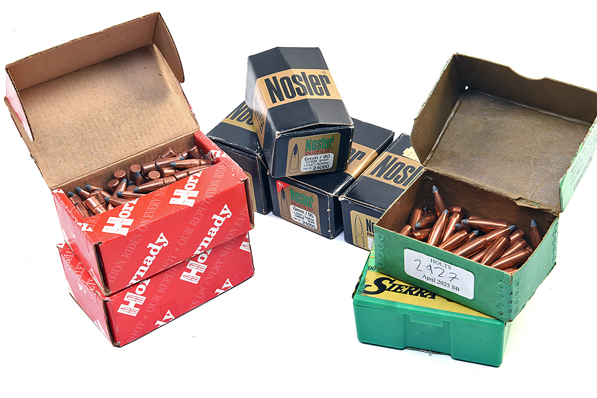 A QUANTITY OF UNUSED 30 CAL AND .243 BULLET HEADS IN BOXES, comprises of approx 100 'NOSLER' ballistic tip 6mm/95 .243 spitzer calibre No. 24095, 12 'NOSLER' ballistic tip 30 cal 180 grain .308 No. 30180, approx 50 'NOSLER' partition 30 cal 150 grain No. 16329, approx 120 'HORNADY' 30 cal 150 grain interlock, approx 50 'SIERRA' 30 cal 150 grain spitzer boat tail No. 2125, approx 30 'SIERRA' 30 cal 165 grain spitzer boat tail No. 21485