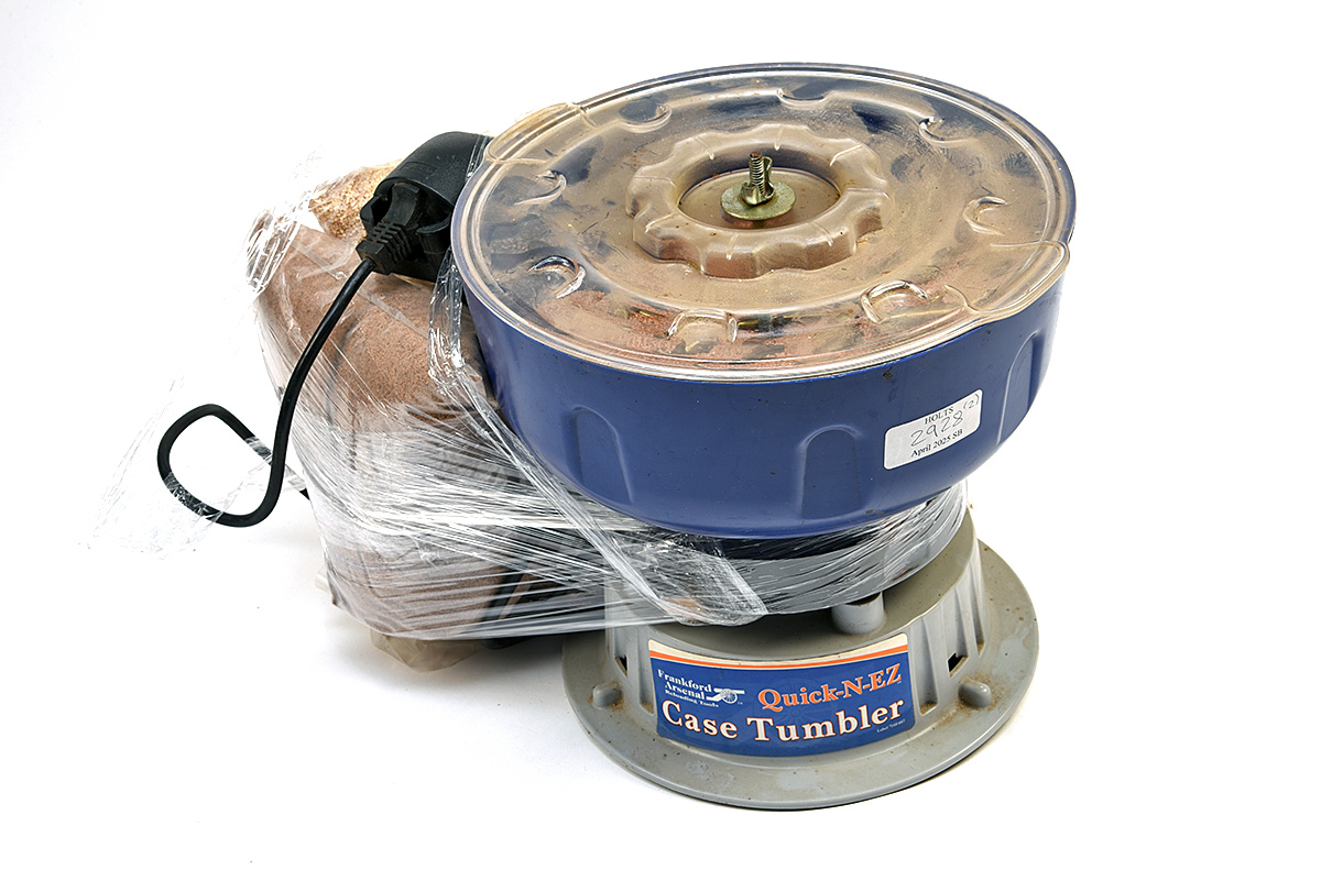 A FRANKFORD ARSENAL QUICK-N-EZ CASE TUMBLER, 3 BAGS OF MEDIA AND A RCBS CHARGE MASTER 1500 SCALE, (2)