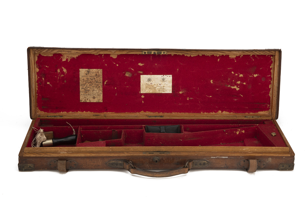 fitted for 30in. barrels, red baize-lined interior, lid with some mothing and 'Charges for Breech-Loading Gun No. 10172', central push-button brass lock (no key)