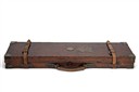 A BRASS-CORNERED OAK AND LEATHER GUNCASE,