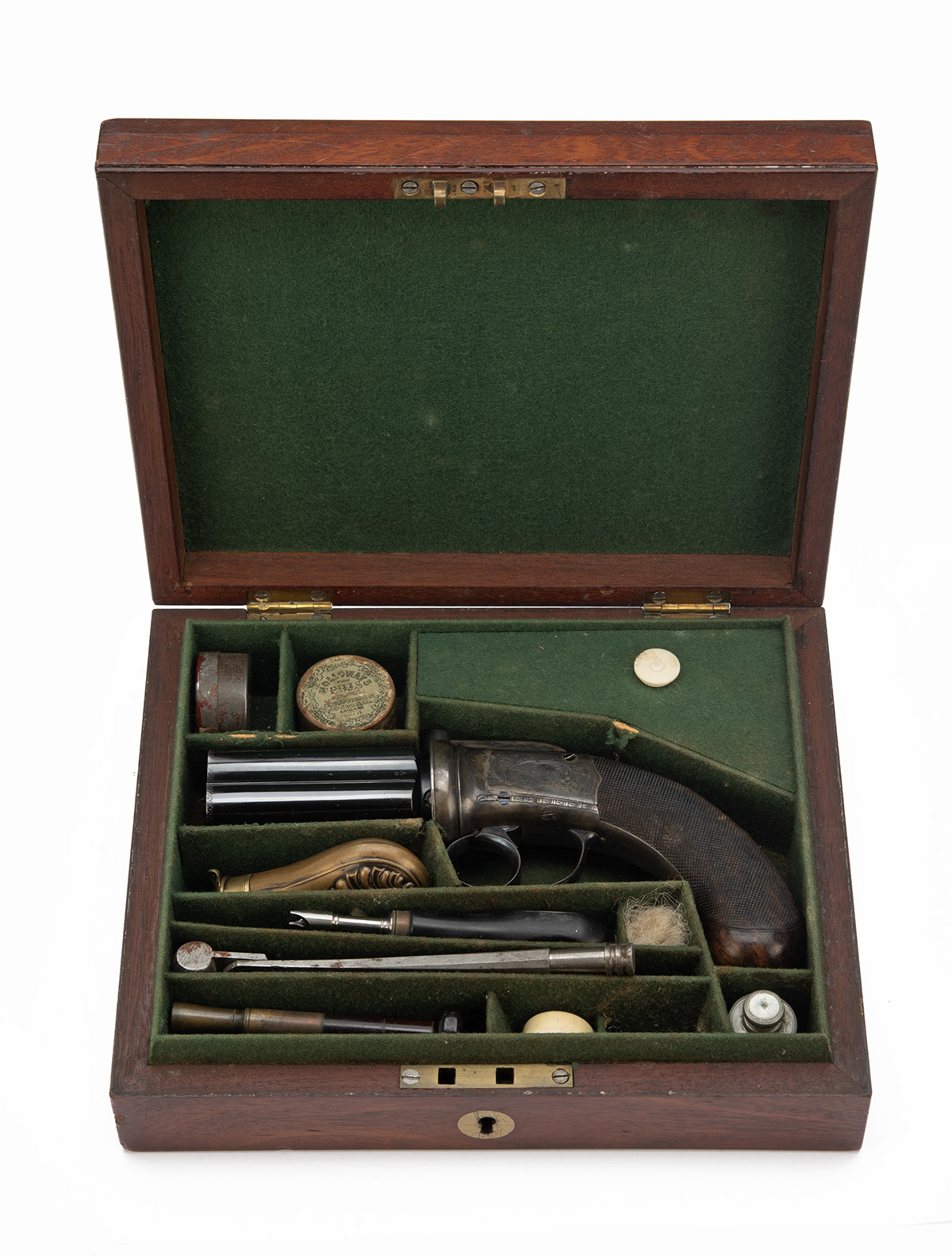 AN OUTSTANDING CASED 50-BORE PERCUSSION FOUR-SHOT PEPPERBOX REVOLVER SIGNED NEEDLER, HULL, no visible serial number,