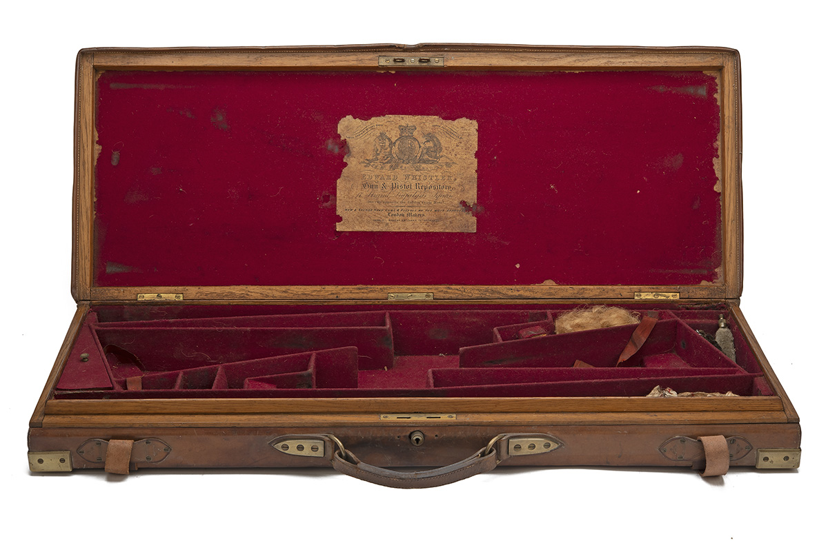 fitted for 30in. barrels, the interior lined with maroon baize, an Edward Whistler trade label, central brass push-button lock (key missing), the lid exterior marked 'A.M.T.'