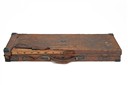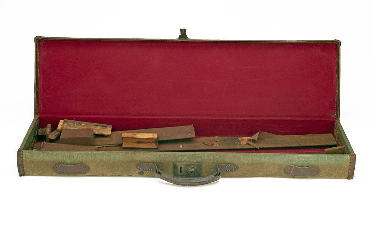 A DOUBLE GUNCASE AND A SINGLE GUNCASE, a brass-cornered oak and leather double guncase, in need of attention, together with a brass-cornered canvas single guncase, in need of attention (2)