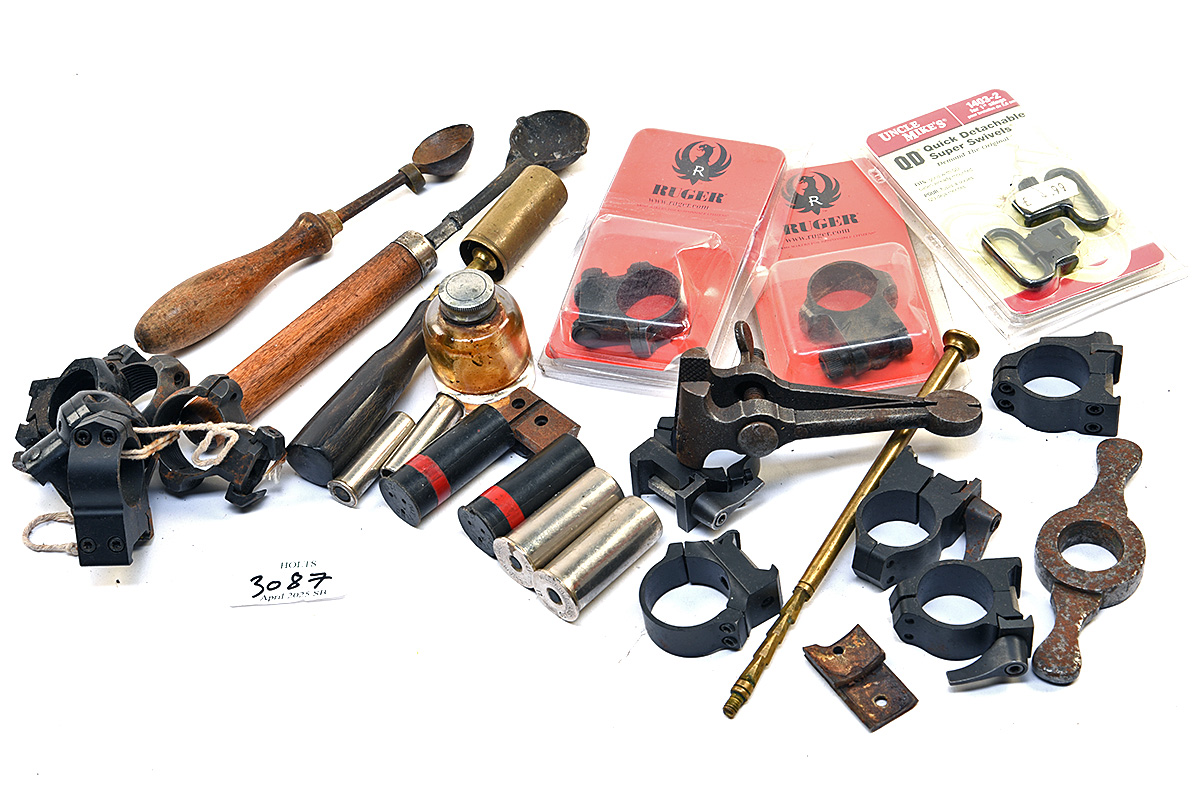 A 'G. J. HAWKSLEY' EBONY HANDLE 12-BORE CHAMBER BRUSH WITH A QUANTITY OF SHOOTING RELATED ITEMS, comprising of 2 'WILLIAM EVANS' 12-bore nickel plated snap cap, 1 'PARKER' .410 nickel plated snap cap, 1 nickel plated .410 snap cap, 1 vintage glass round oil pot (crack visible) 2 wood handle crucibles, 1 'G. J. HAWKSLEY' ebony handle brass 12-bore chamber brush, 12bore resizer, iron hand vice, 2 unused 'RUGER' 30MM scope rings, 1 unused 'UNCLE MIKES' quick detachable swivels, 8 various scope rings