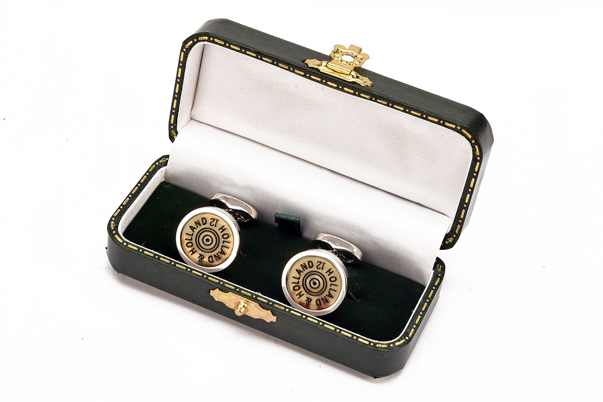A SET OF CARTRIDGE HEAD HORN AND RHODIUM CUFFLINKS,