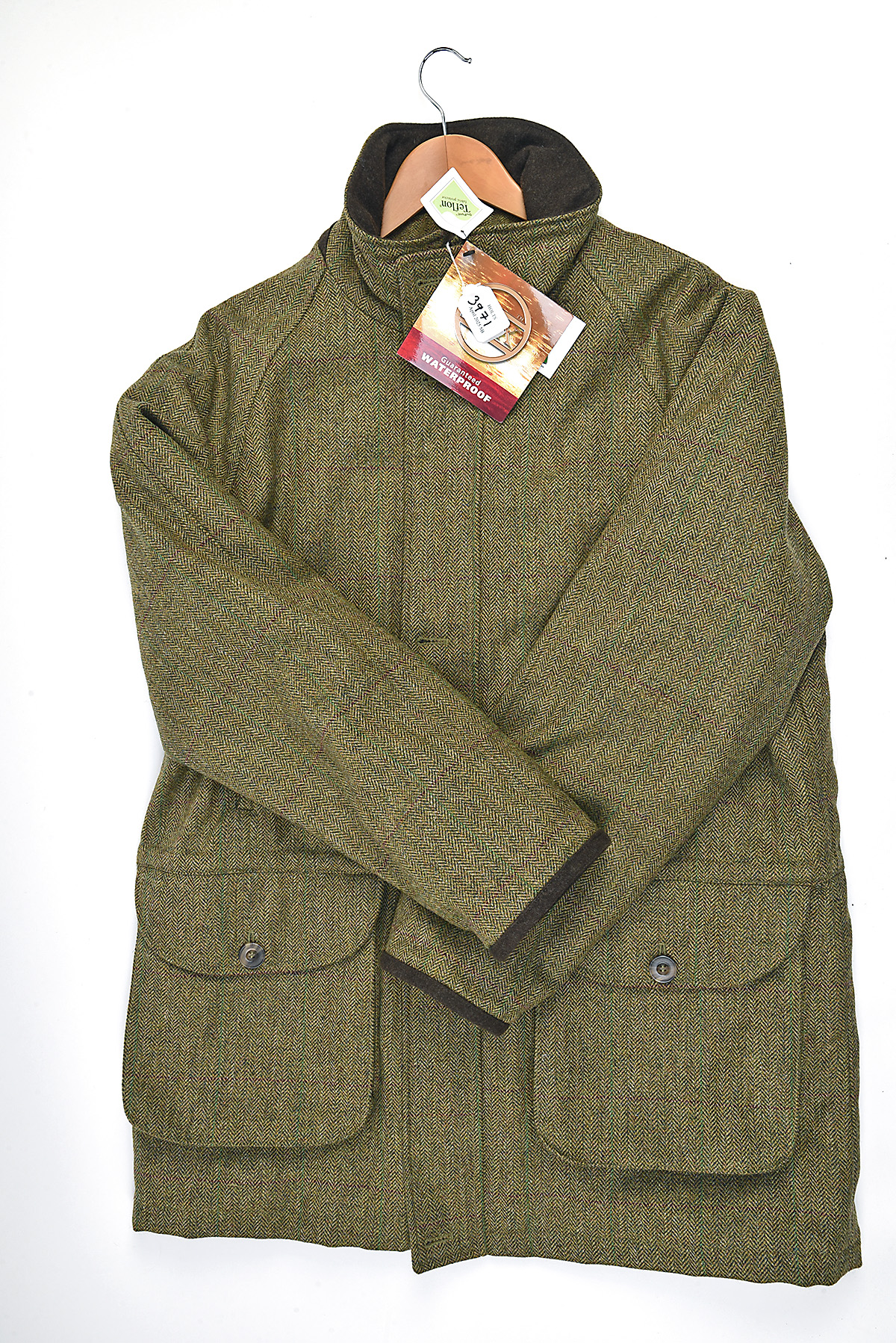 A UNUSED 'LAKSEN DORSET ROXBURY' TWEED COAT, CTX waterproof membrane, teflon coated, 'THRIE ESTAITS' luxury sporting 'OVERCHECK HERRINGBONE' tweed in green with burgundy and light green check, size 2XL